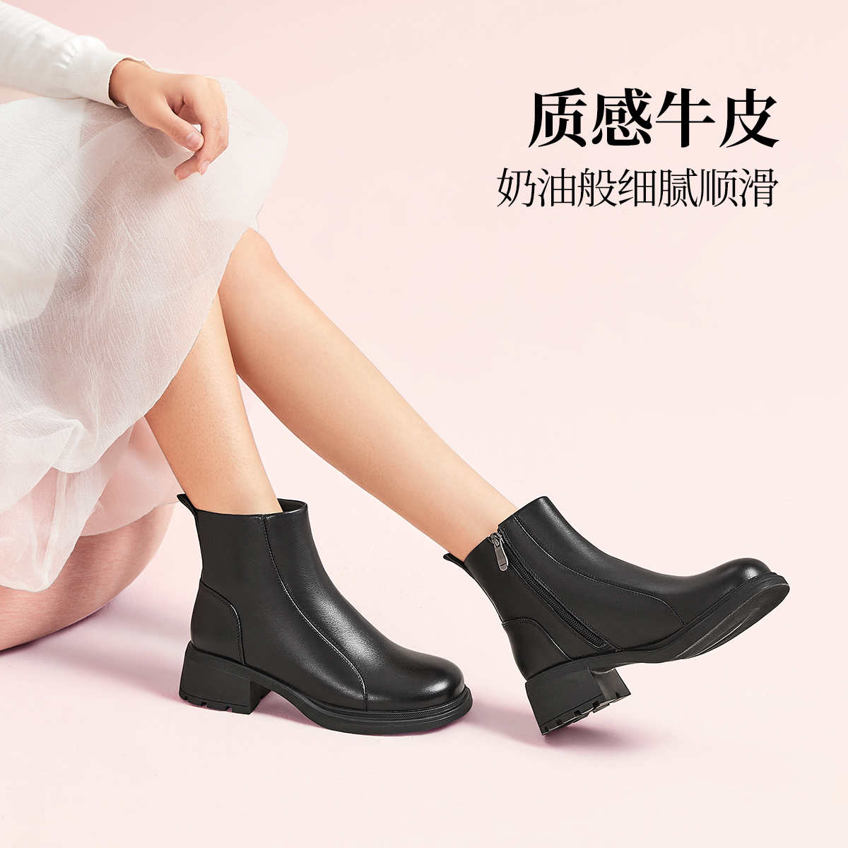 骆驼鞋子女2025新款爆款冬季真皮瘦瘦靴子女粗跟弹力切尔西靴短靴