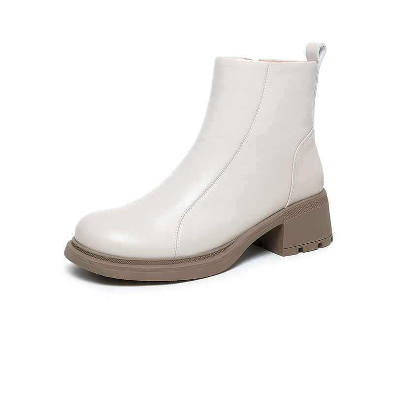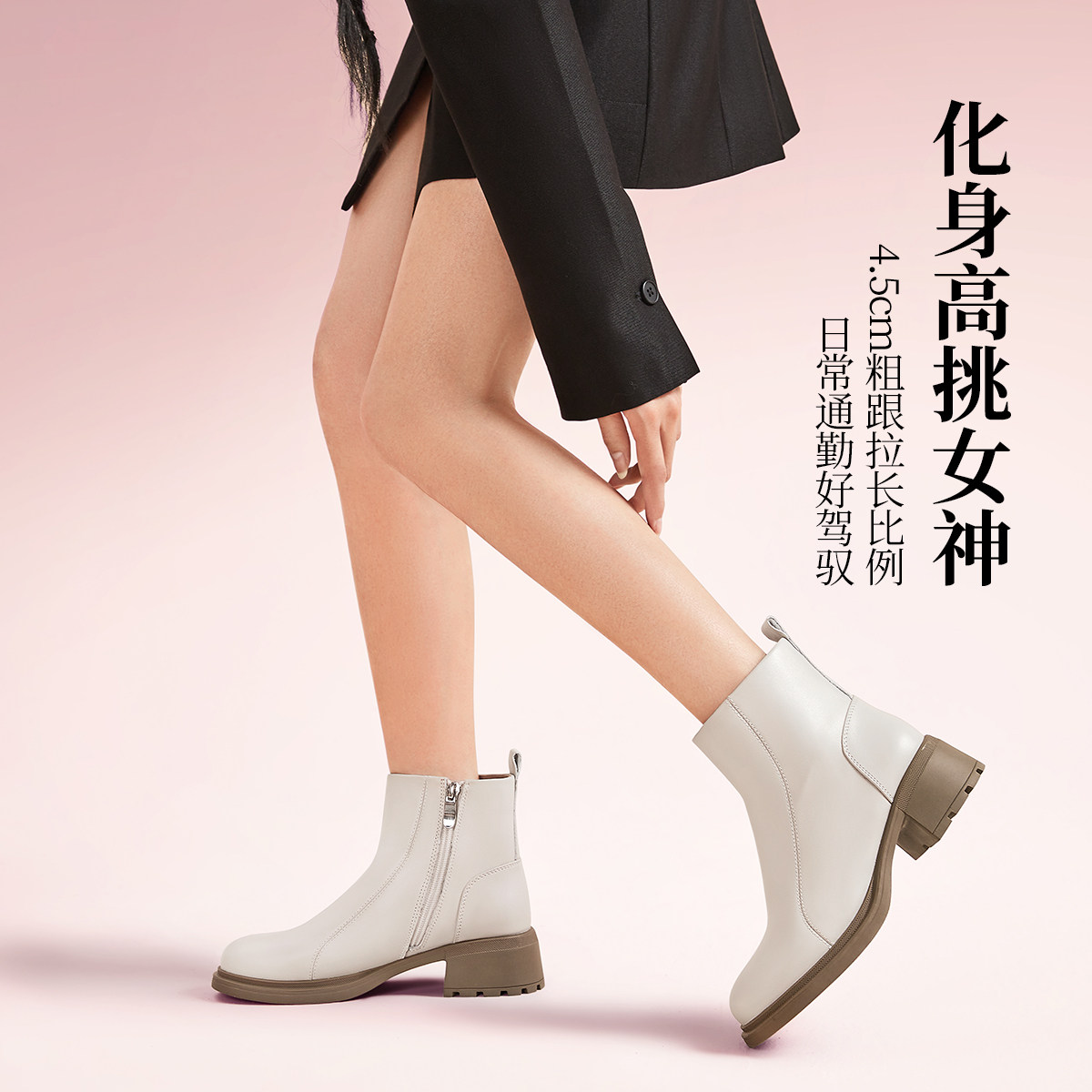 真皮白色高跟短靴女2025秋冬加绒保暖防滑增高粗跟瘦瘦软底马丁靴