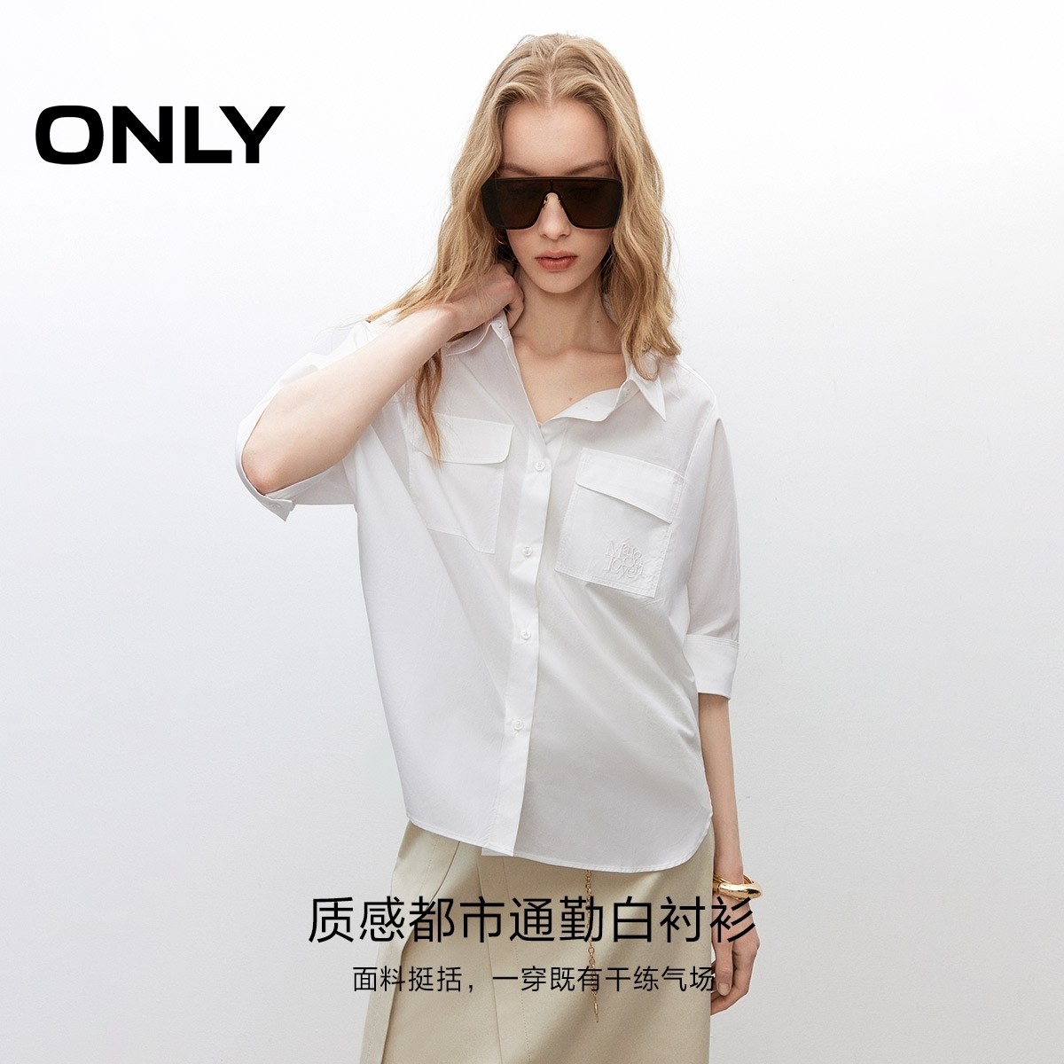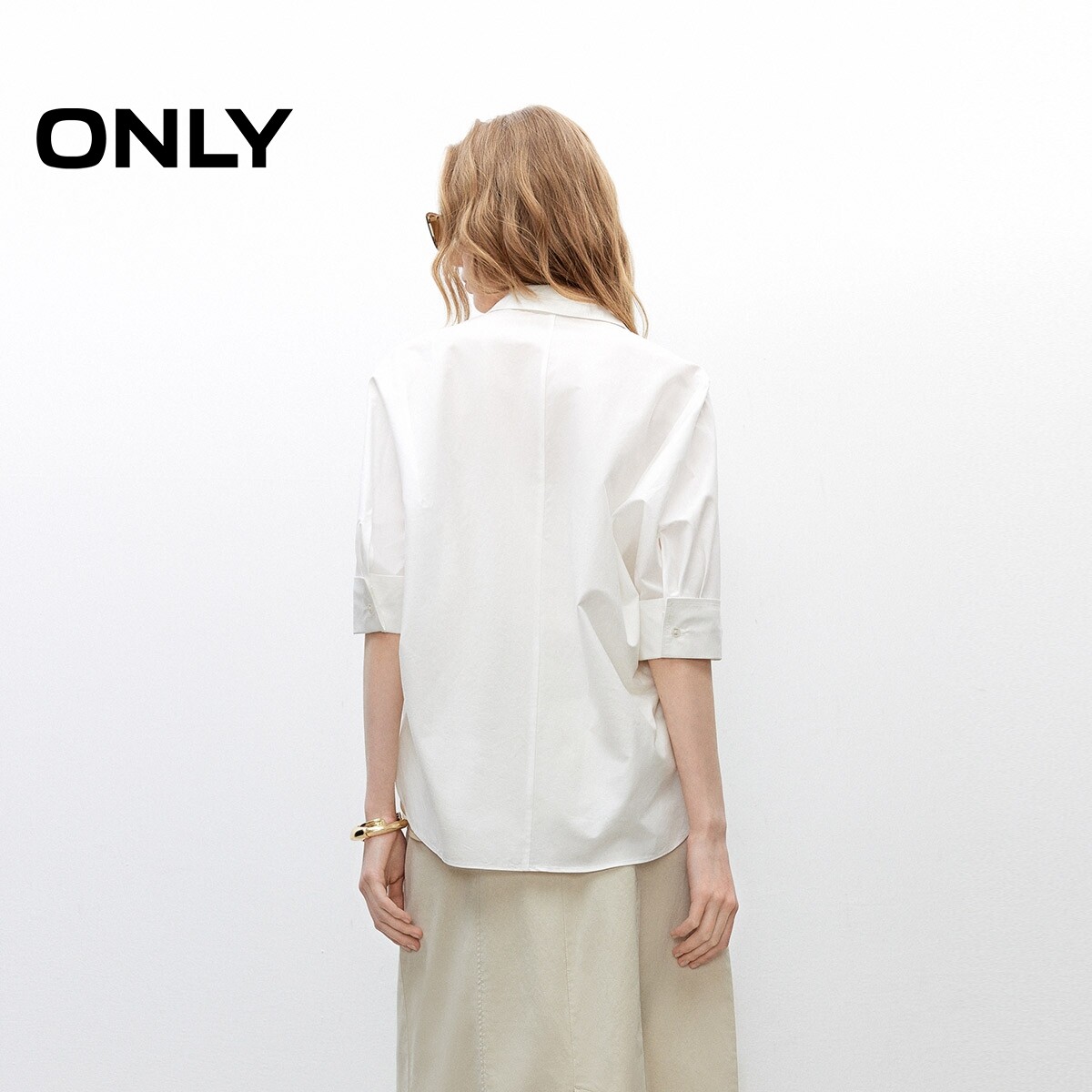 ONLY夏季通勤简约纯色挺括连肩翻领宽松短袖白衬衫上衣女
