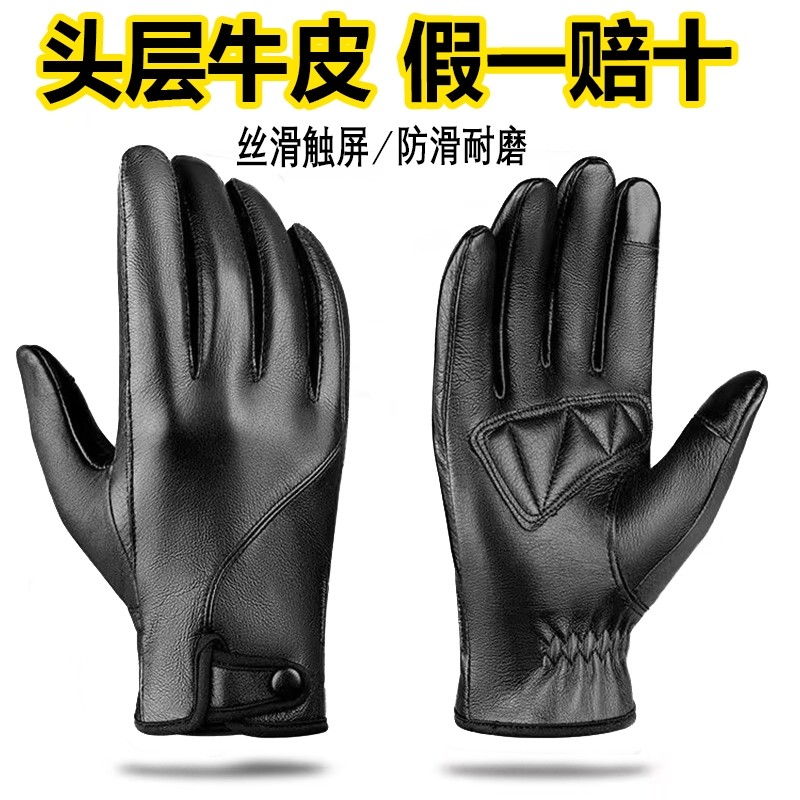 牛皮手套男士四季保暖薄款骑行机车触屏真皮防风防水皮革骑车黑色