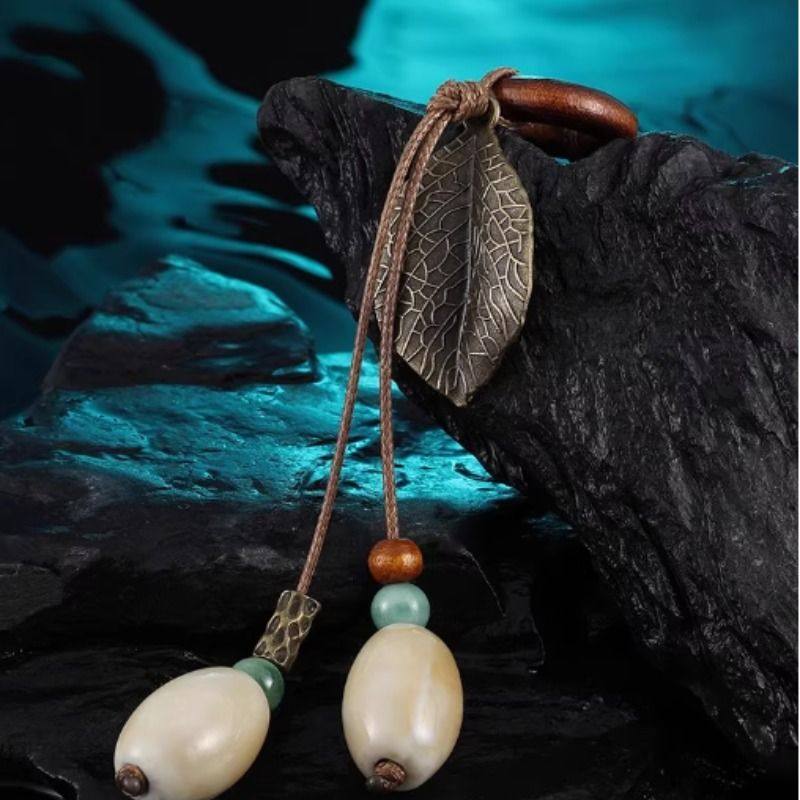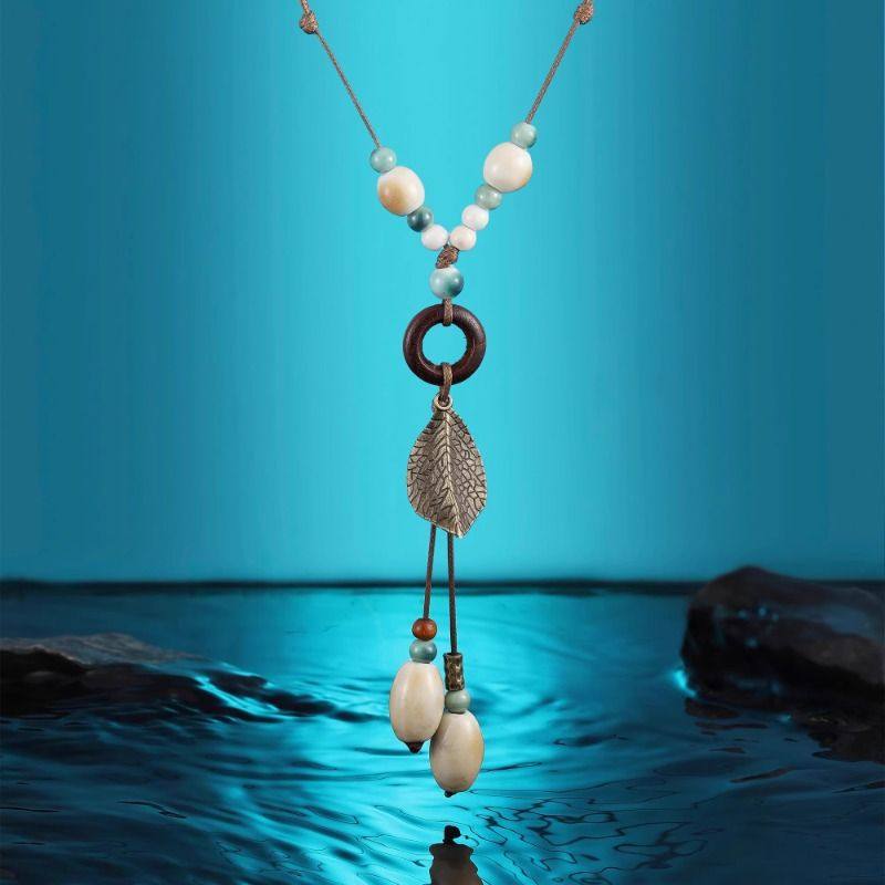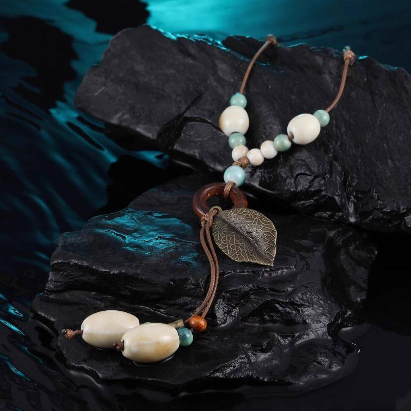 复古圆环树叶流苏长款项链女款民族风陶瓷串珠吊坠毛衣链秋冬配饰