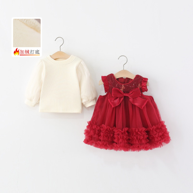 [抗菌远红外]女童连衣裙宝宝高领加绒蓬蓬网纱裙子儿童红色公主裙