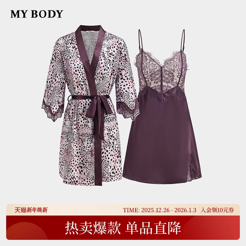 商场同款MYBODY新款性感撩人豹纹印花蕾丝睡衣浴袍吊带两件套睡裙