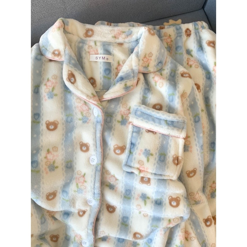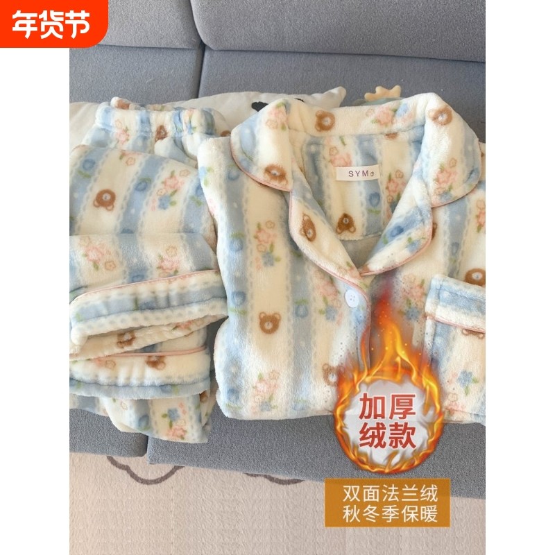 红豆小熊加厚法兰绒大码睡衣女秋冬加绒保暖家居服两性价比双面