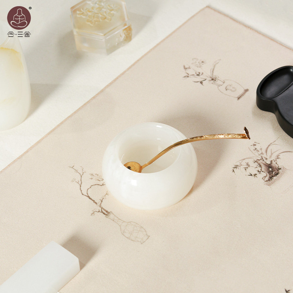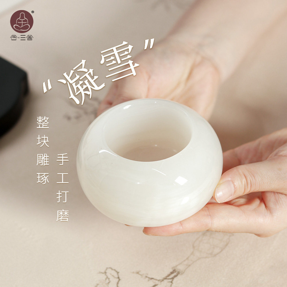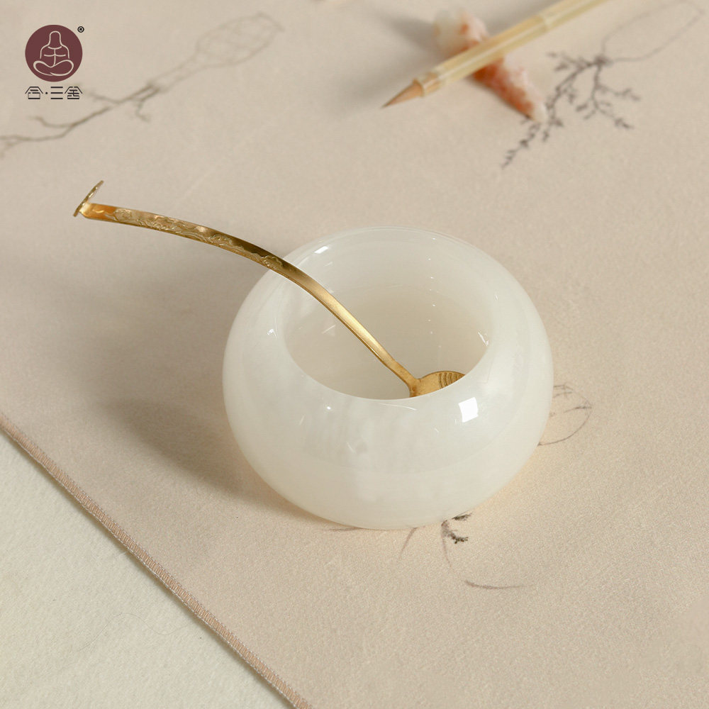 合三舍 凝雪 白玉水盂文房雅器阿富汗玉石笔洗手工原石打磨天然纹理书房水盂高端书法国画多功能储水涮墨摆件