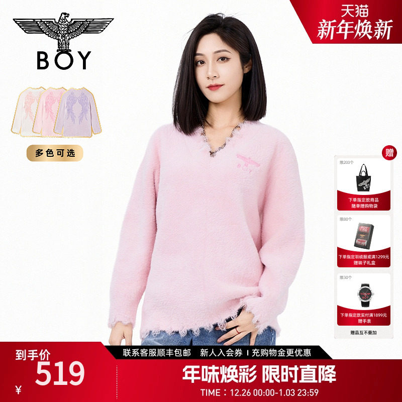 【柔雾天使】BOYLONDON春秋仿貂绒潮牌女款V领长袖针织毛衣W60902