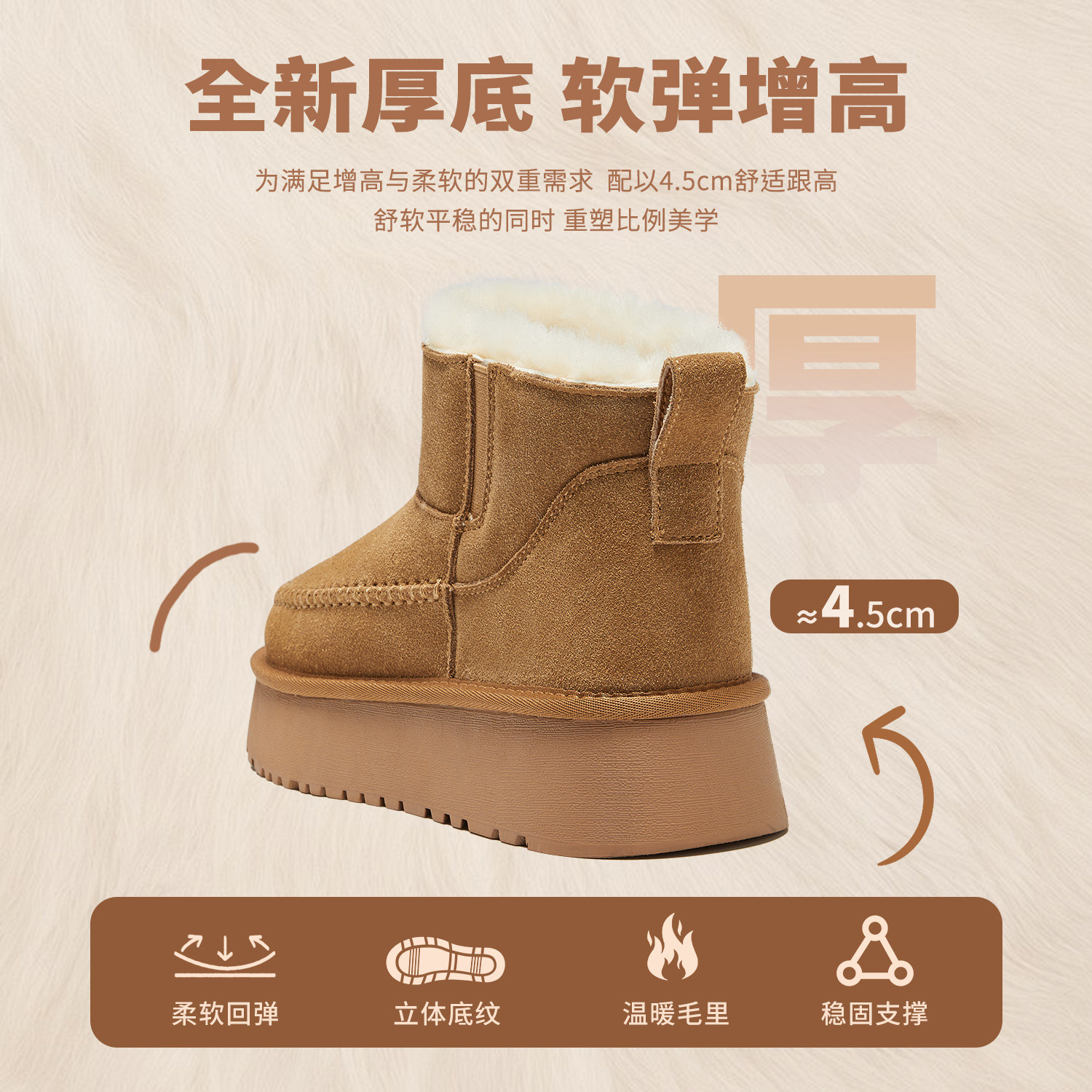 内增高~桑坡真皮厚底羊毛雪地靴女加绒保暖东北棉靴秋冬季短筒靴