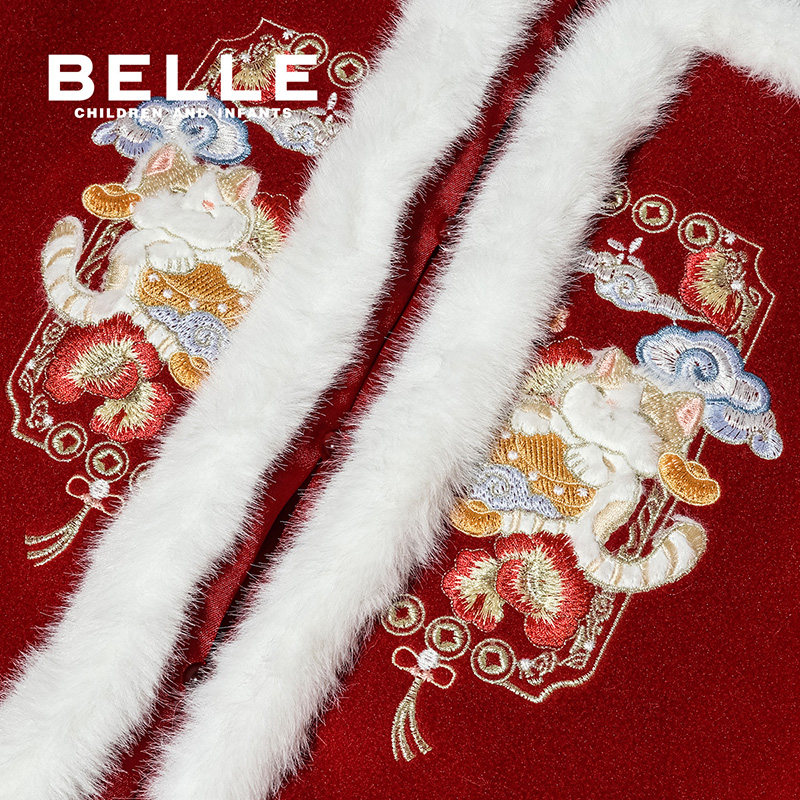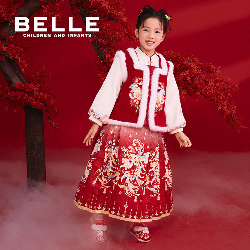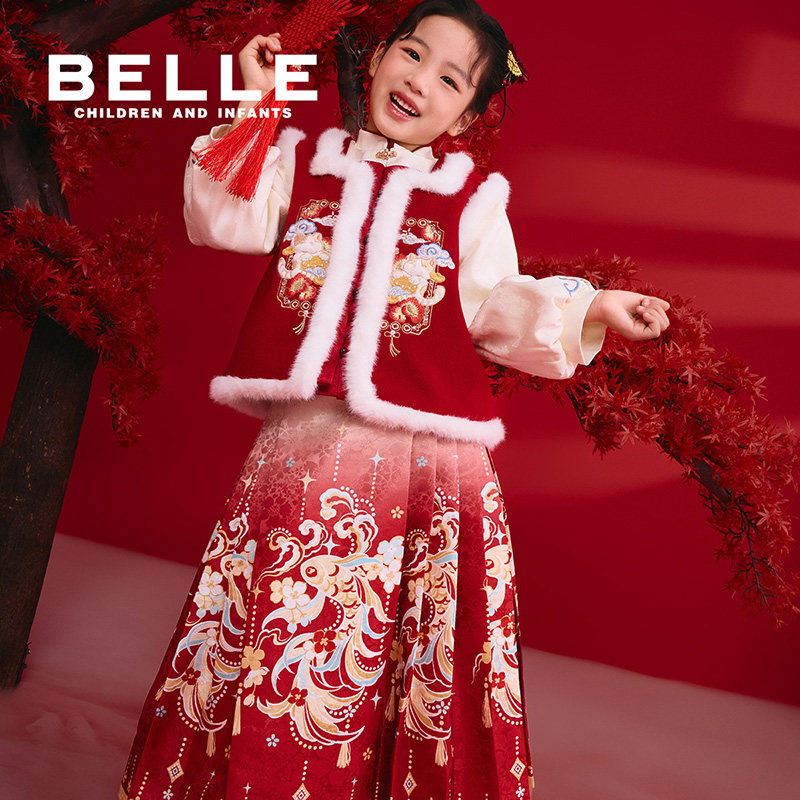 百丽童鞋女童拜年服套装25冬季新款新年马面裙小女孩汉服过年服