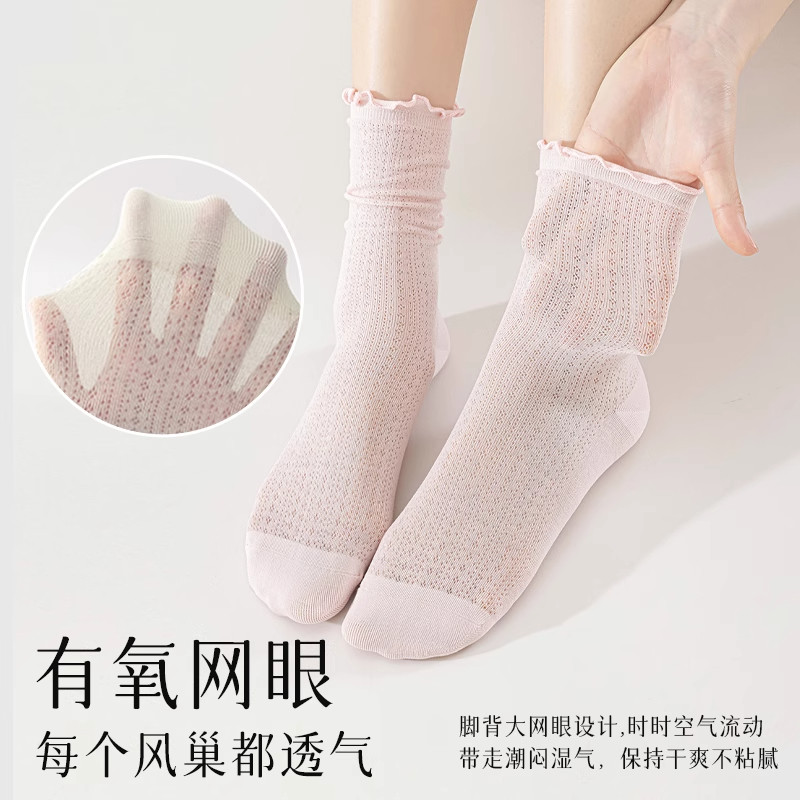 桑蚕丝袜子女夏薄款纯棉中筒袜网眼吸汗透气无骨月子袜花边堆堆袜