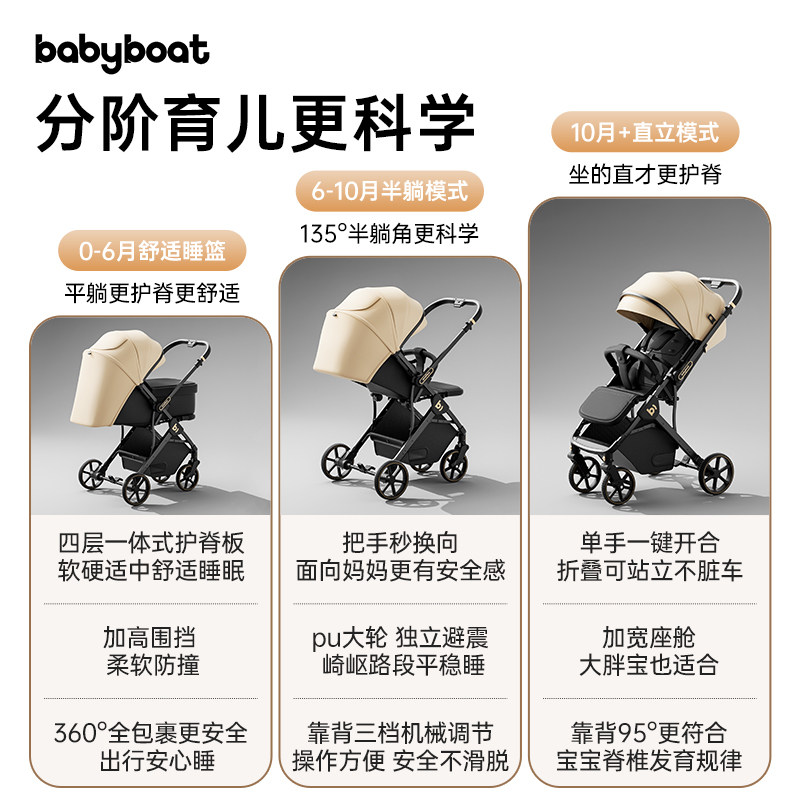 babyboat贝舟B5婴儿车双向轻便折叠新生宝宝0-3岁坐躺高景观推车
