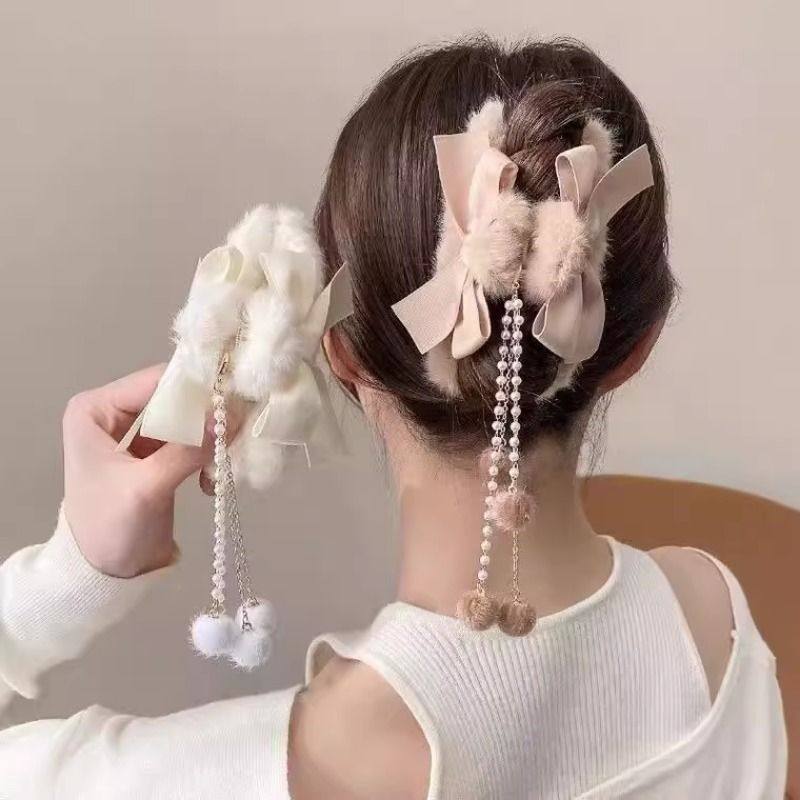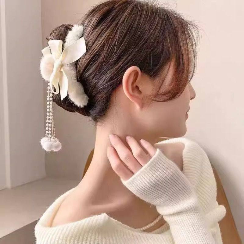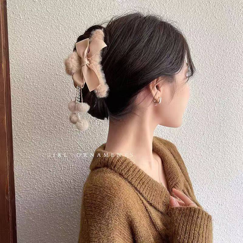 韩国毛毛绒抓夹毛球流苏吊坠蝴蝶结发夹后脑勺盘发发抓大号鲨鱼夹