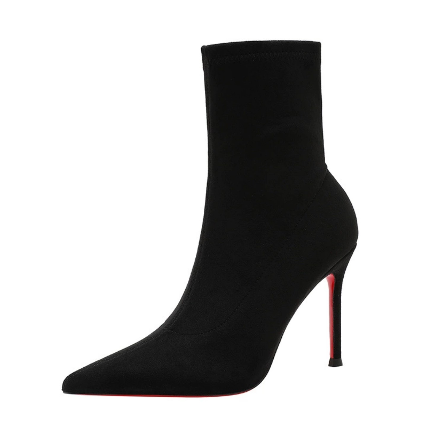 黑色尖头短靴子女2025新款爆款秋冬红底高跟鞋细跟加绒弹力瘦瘦靴