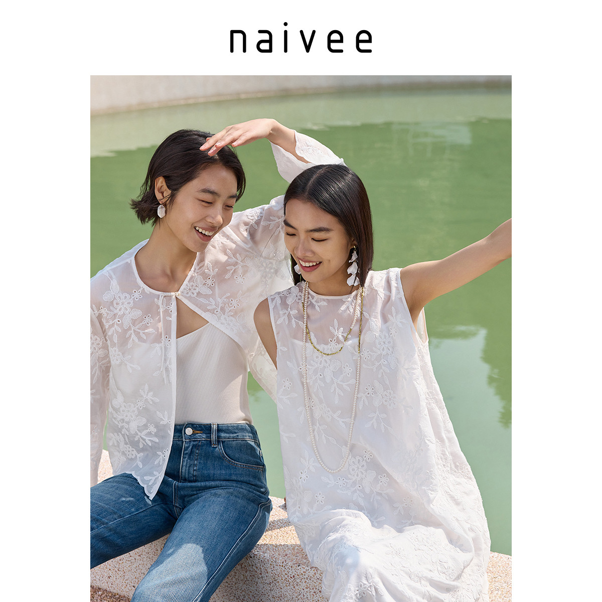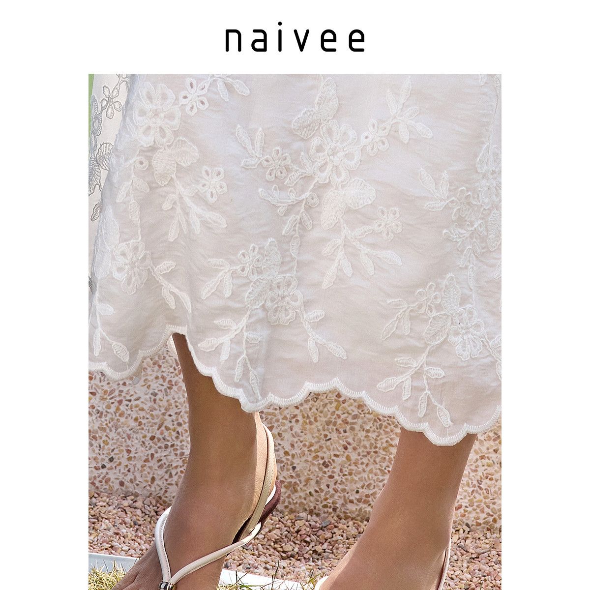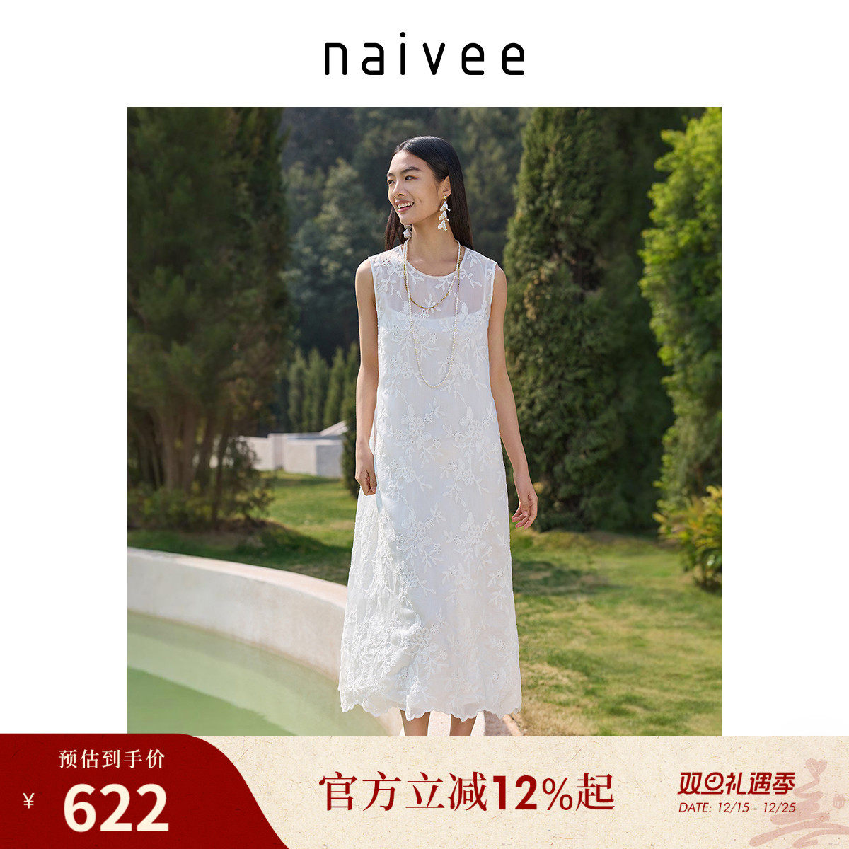 【氧气度假裙】naivee纳薇白色圆领无袖刺绣连衣裙女长款25年夏新