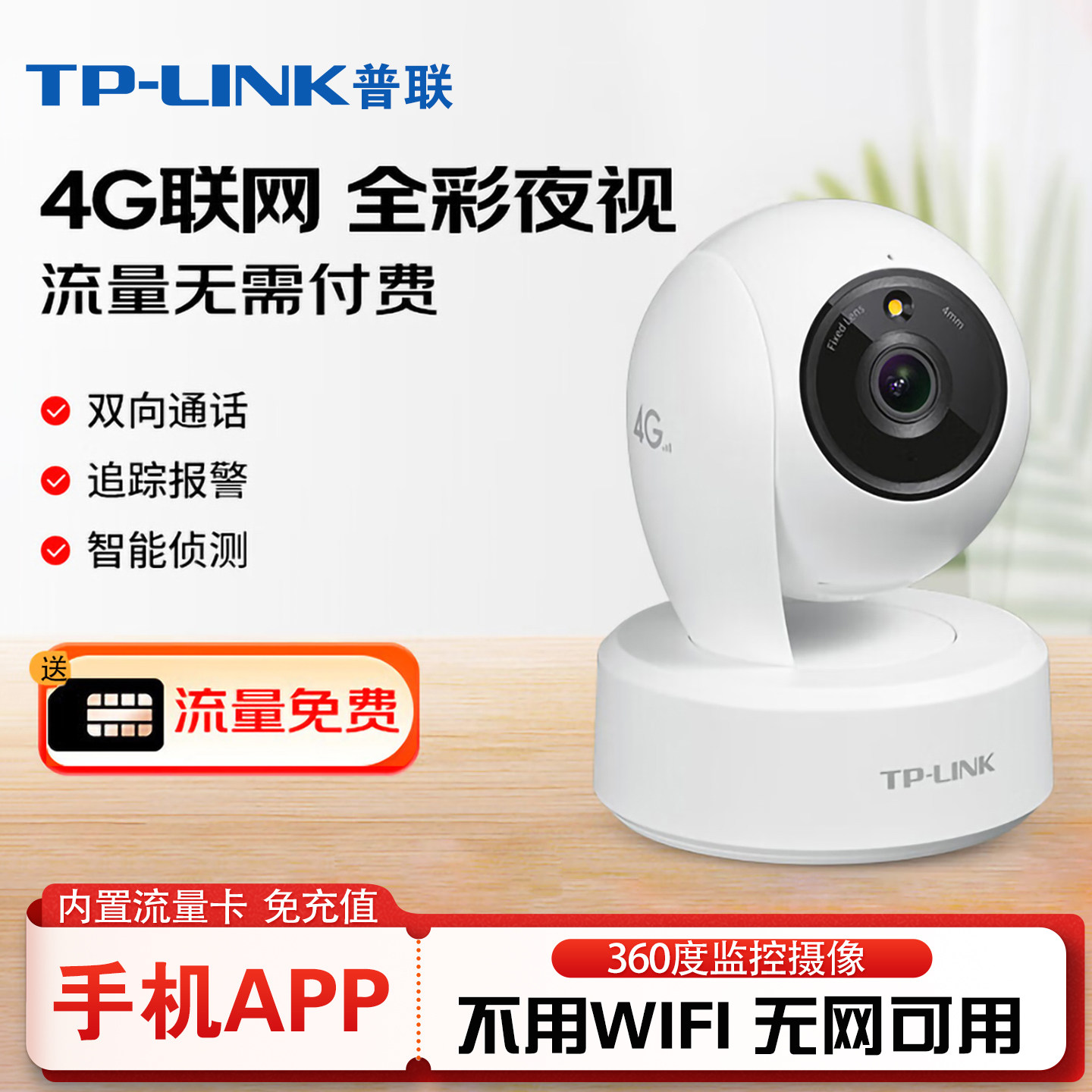 普联tplink家用终身免流量4g监控摄影头360度店铺教室内不用wifi无需网络插卡家庭用无线物联摄像头44AW-F4GE
