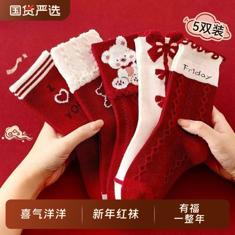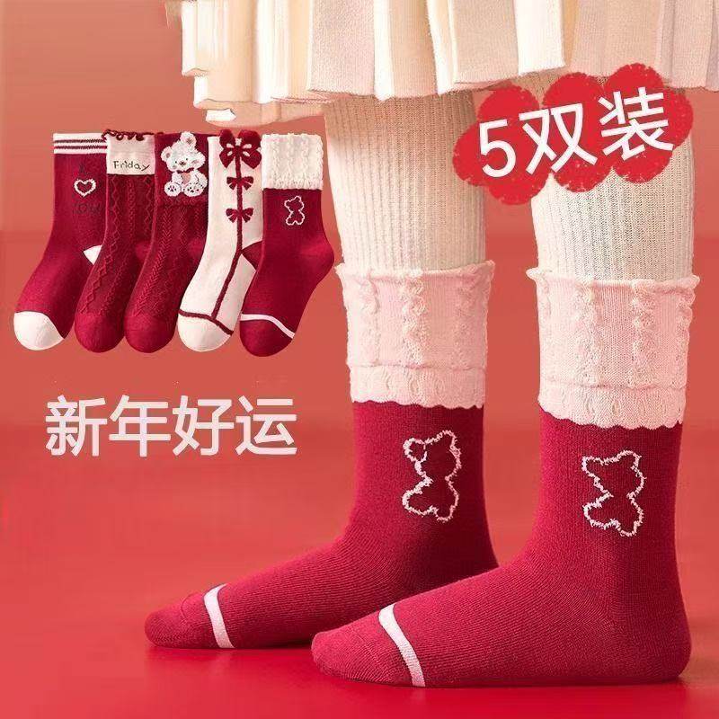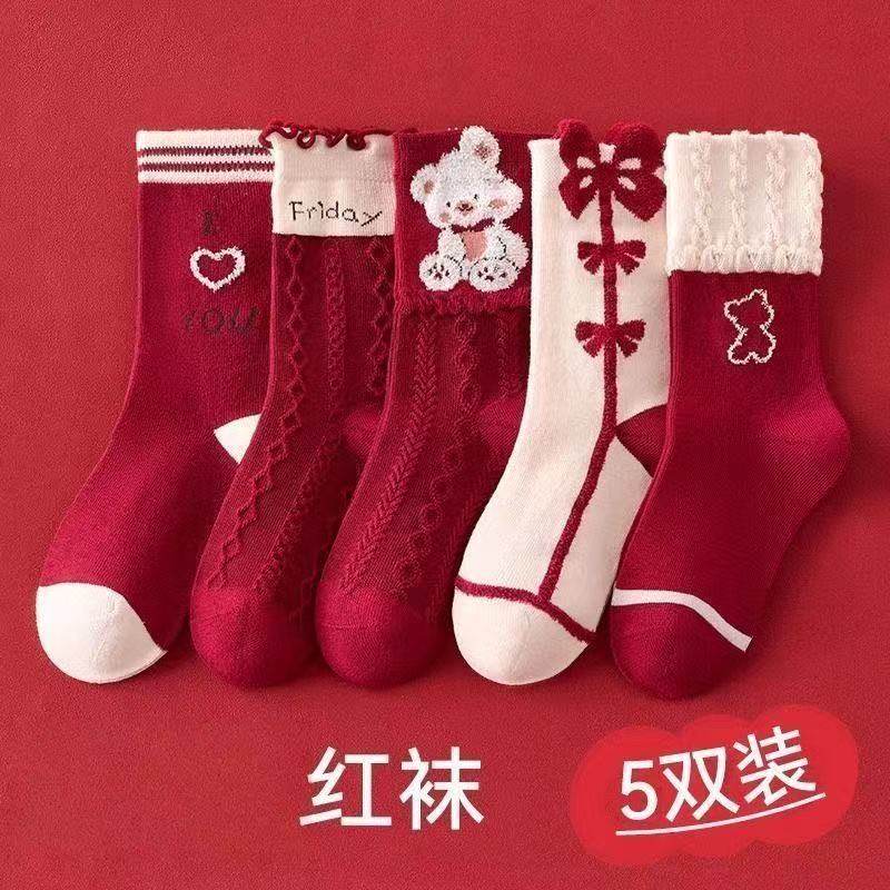 女童袜子冬季棉袜红色棉袜小女孩宝宝甜美可爱新年袜子儿童中筒袜
