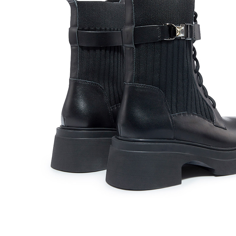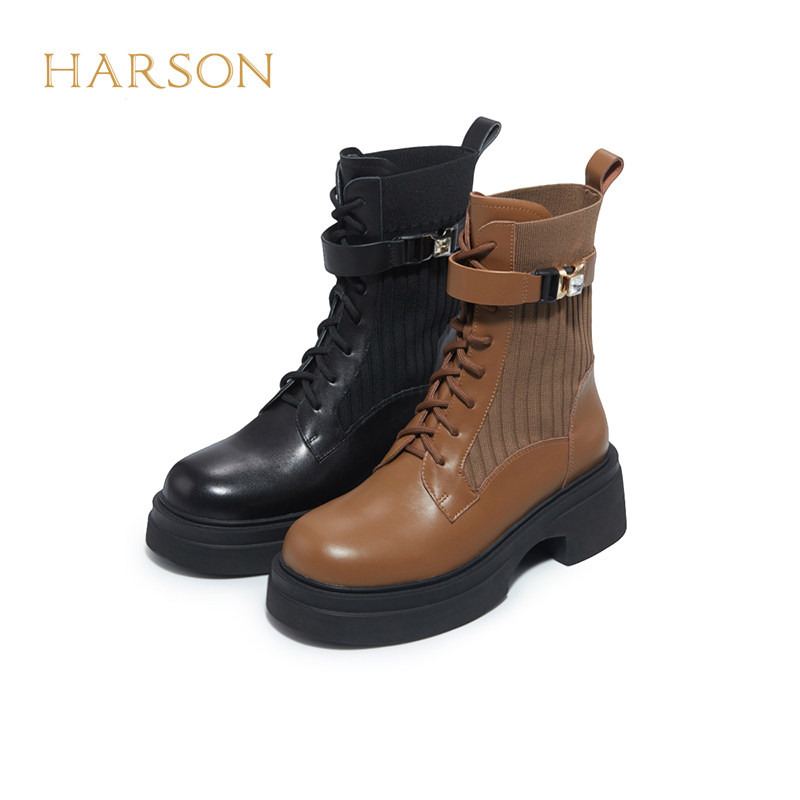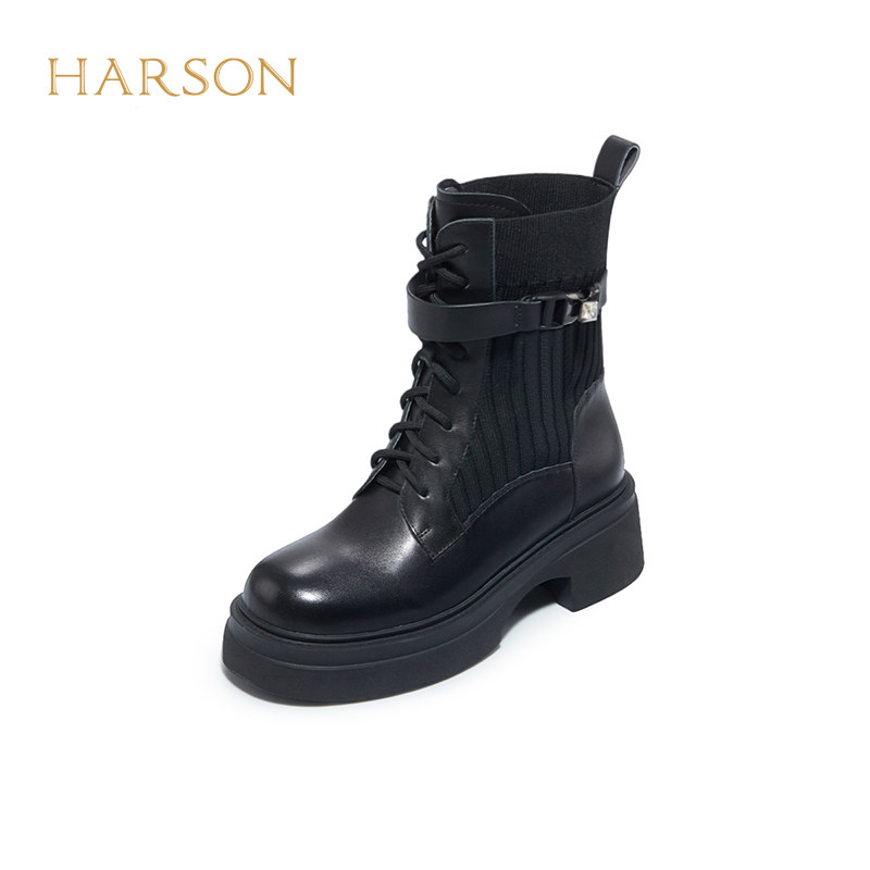哈森秋季弹力袜靴女帅气个性机车厚底时装靴前系带马丁靴HA228803