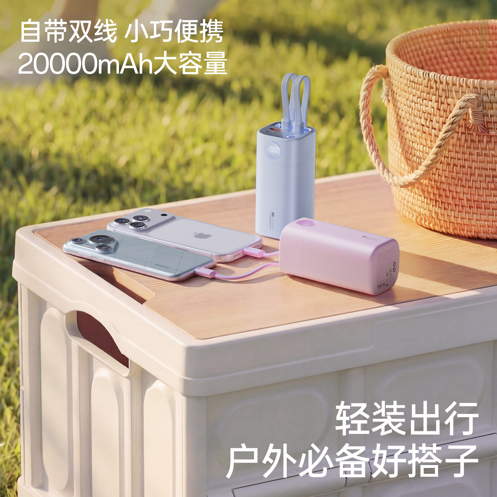 3C认证沃品充电宝20000毫安35W快充便携大容量自带线户外移动电源