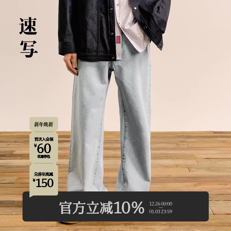 速写男装秋冬新款宽松阔腿牛仔裤直筒休闲时尚潮流舒适男士长裤