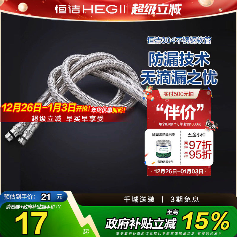 HEGII恒洁不锈钢304金属编织冷热进水软管马桶热水器防爆4分接口