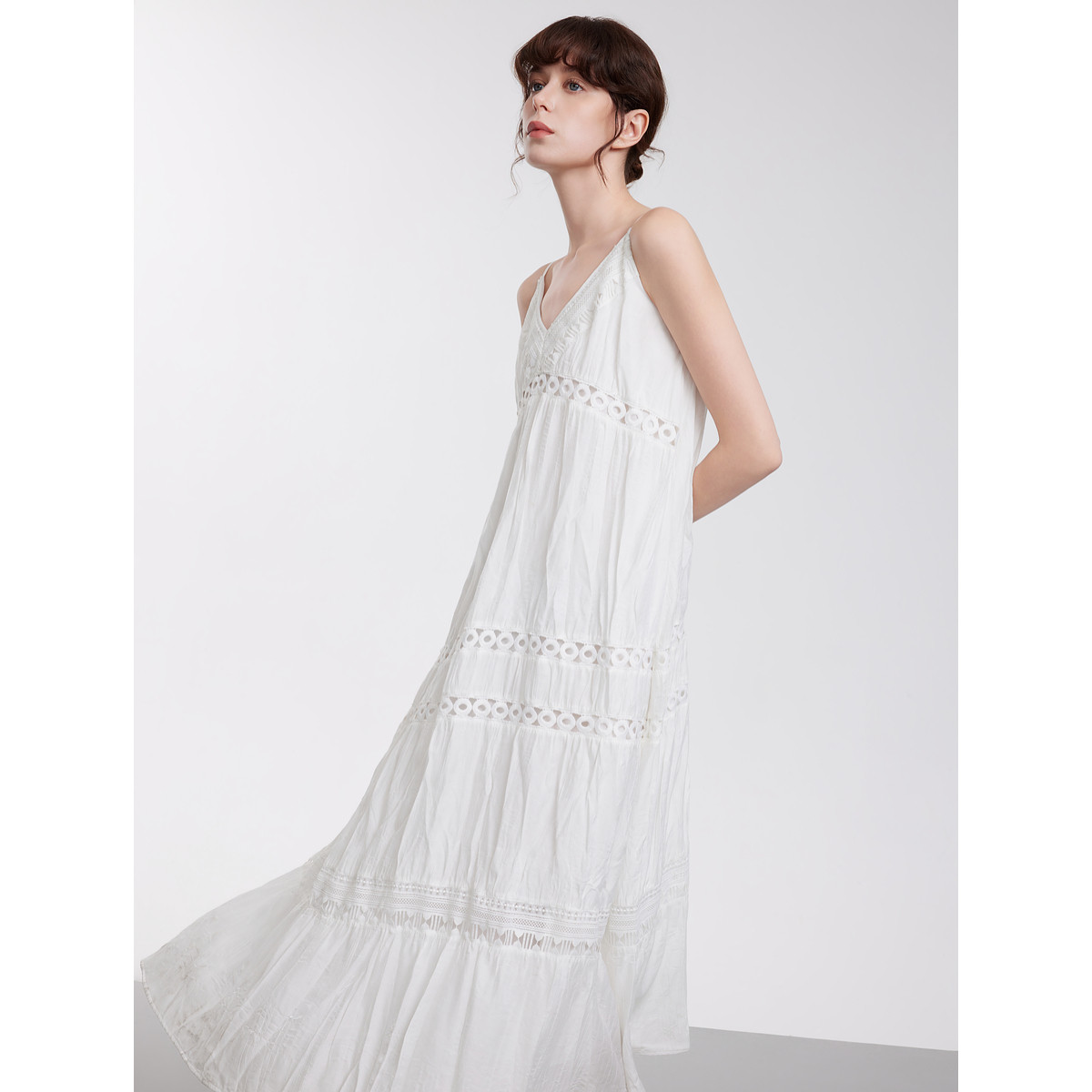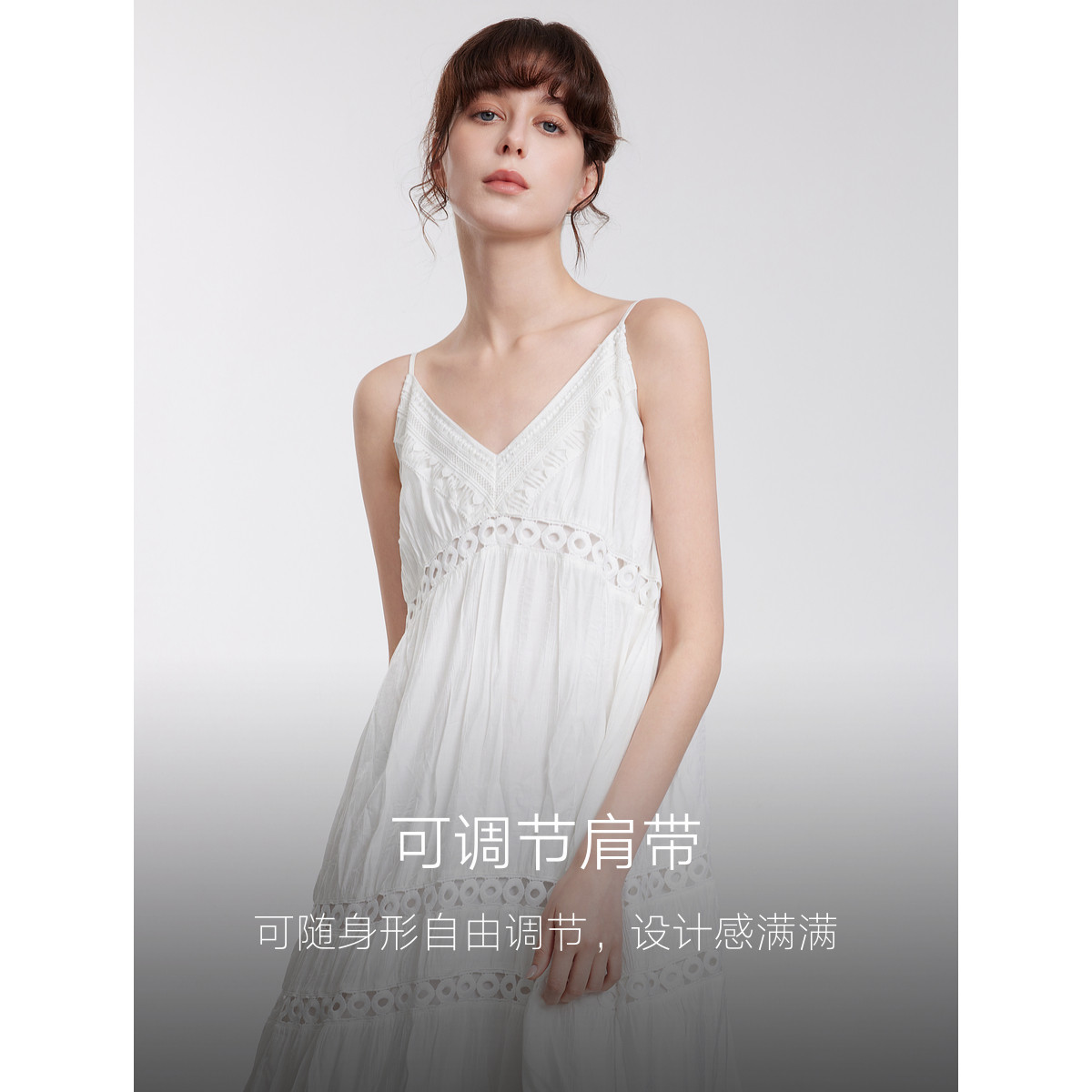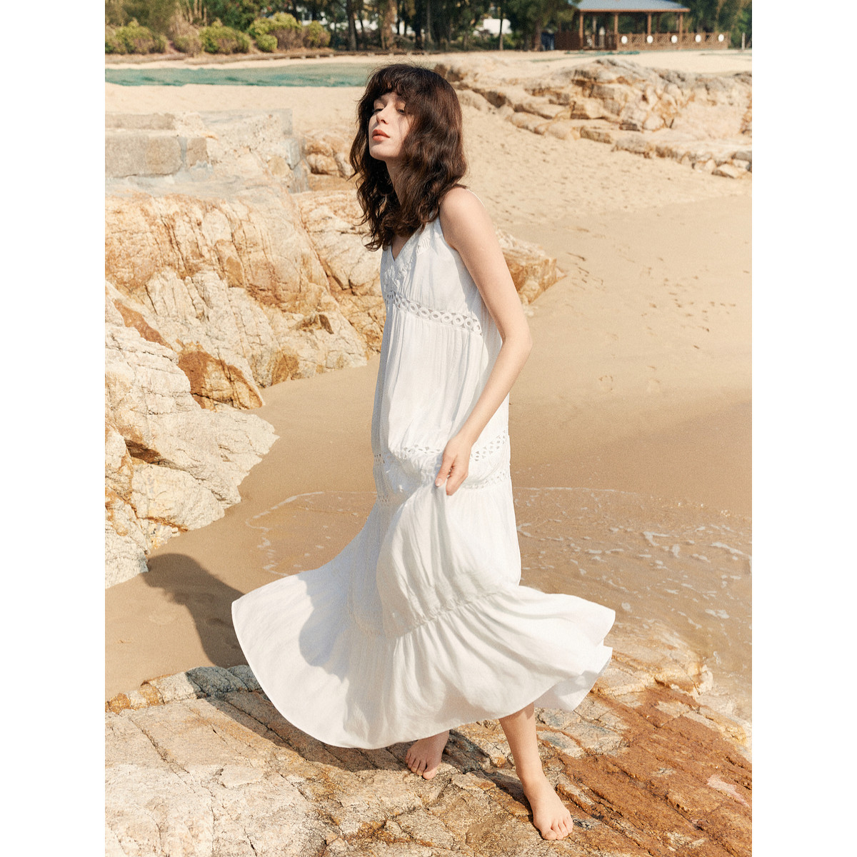 【浅白月光】ELLE白色拼接花边吊带连衣裙女2025夏新款海边沙滩裙