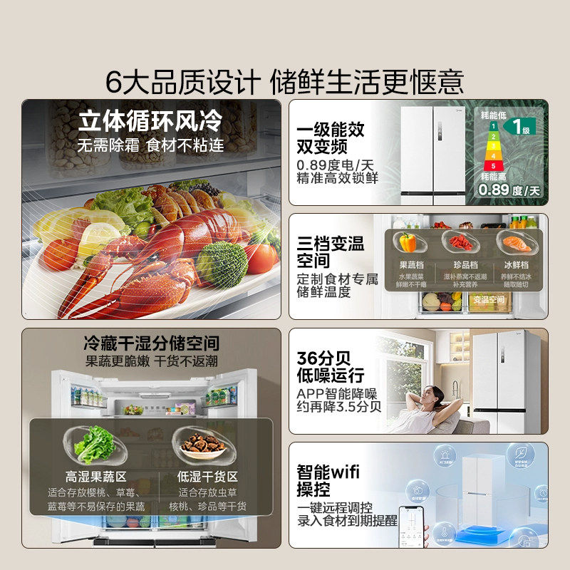 美的508双系统家用大容量净味冰箱十字双开四门一级能效风冷无霜