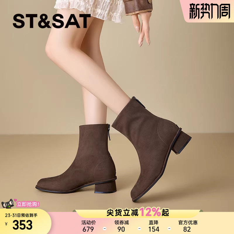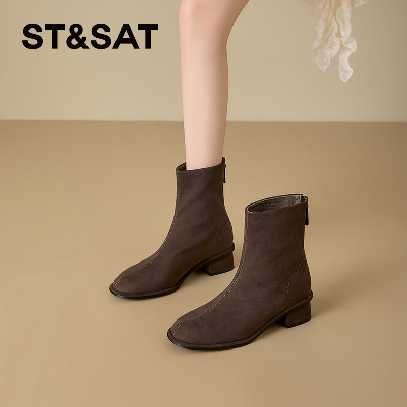 星期六巨舒服复古黑色绒面粗跟中跟短靴女靴2025秋冬新款瘦瘦靴直