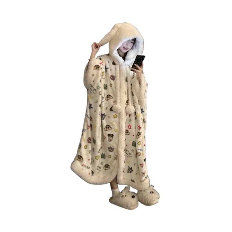 珊瑚绒睡衣女款2025冬季高级感男加厚蜡笔小新睡袍斗篷鲨鱼家居服