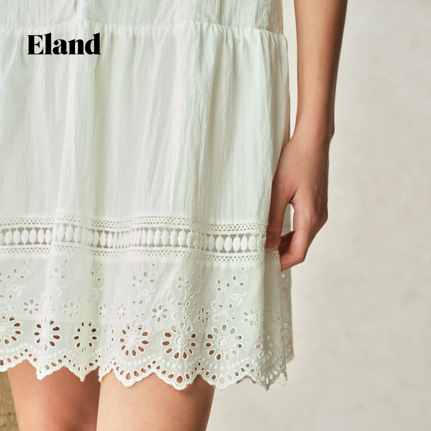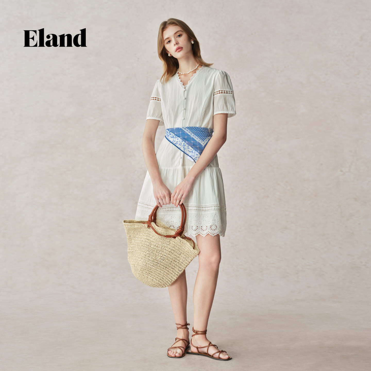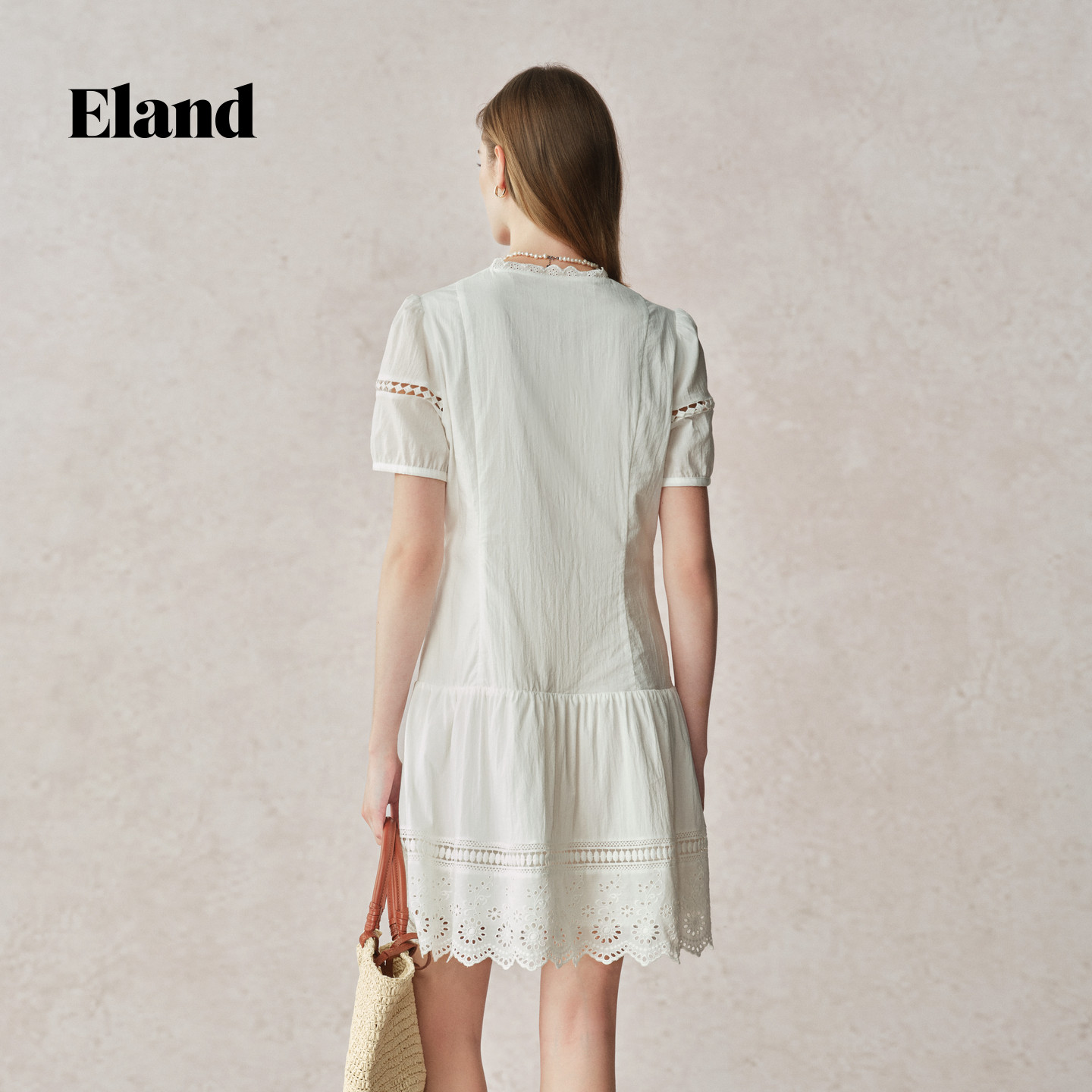 【奶泡裙】Eland衣恋V领连衣裙女收腰蕾丝拼接短袖通勤裙25夏新款