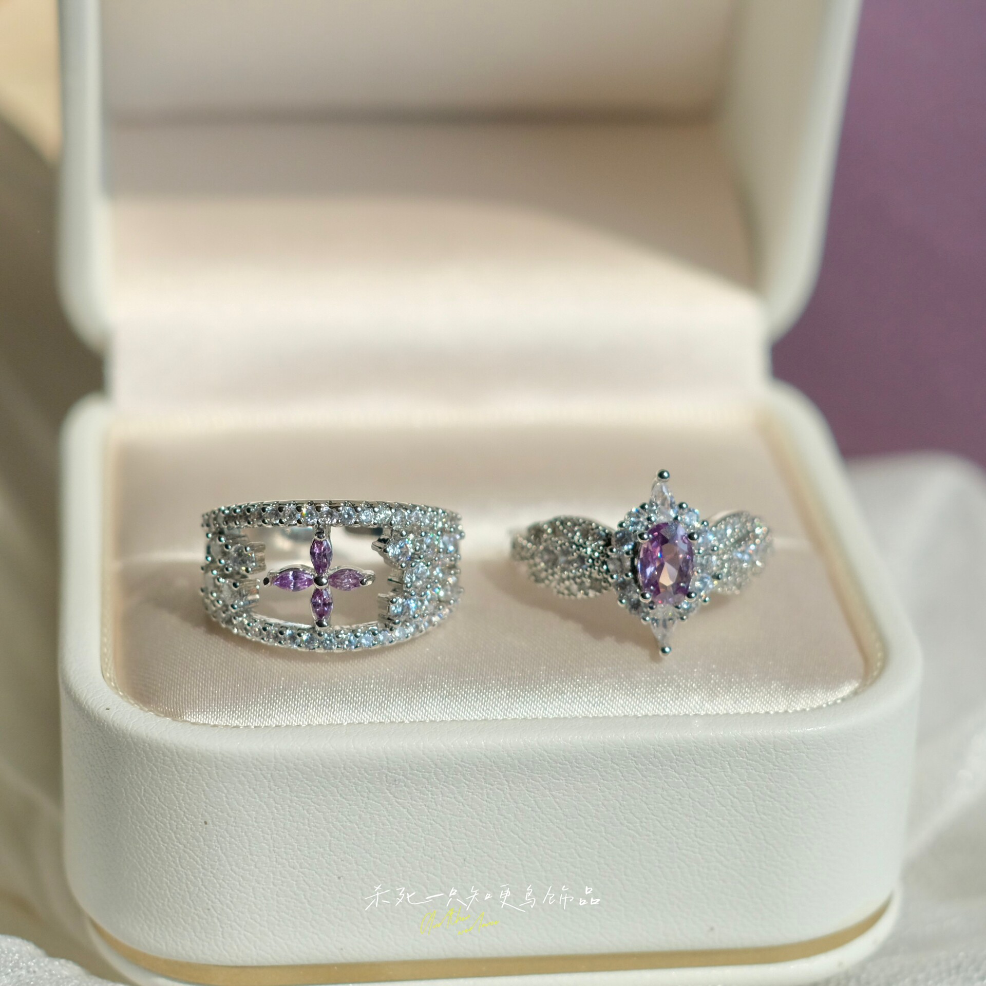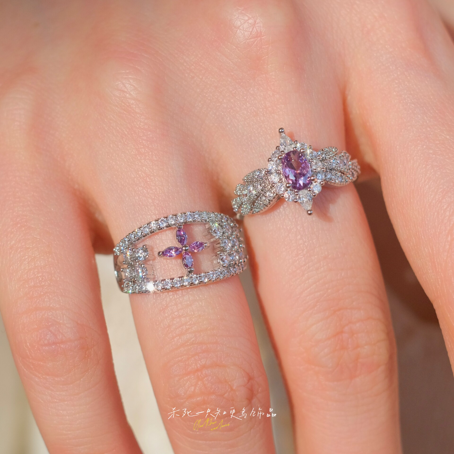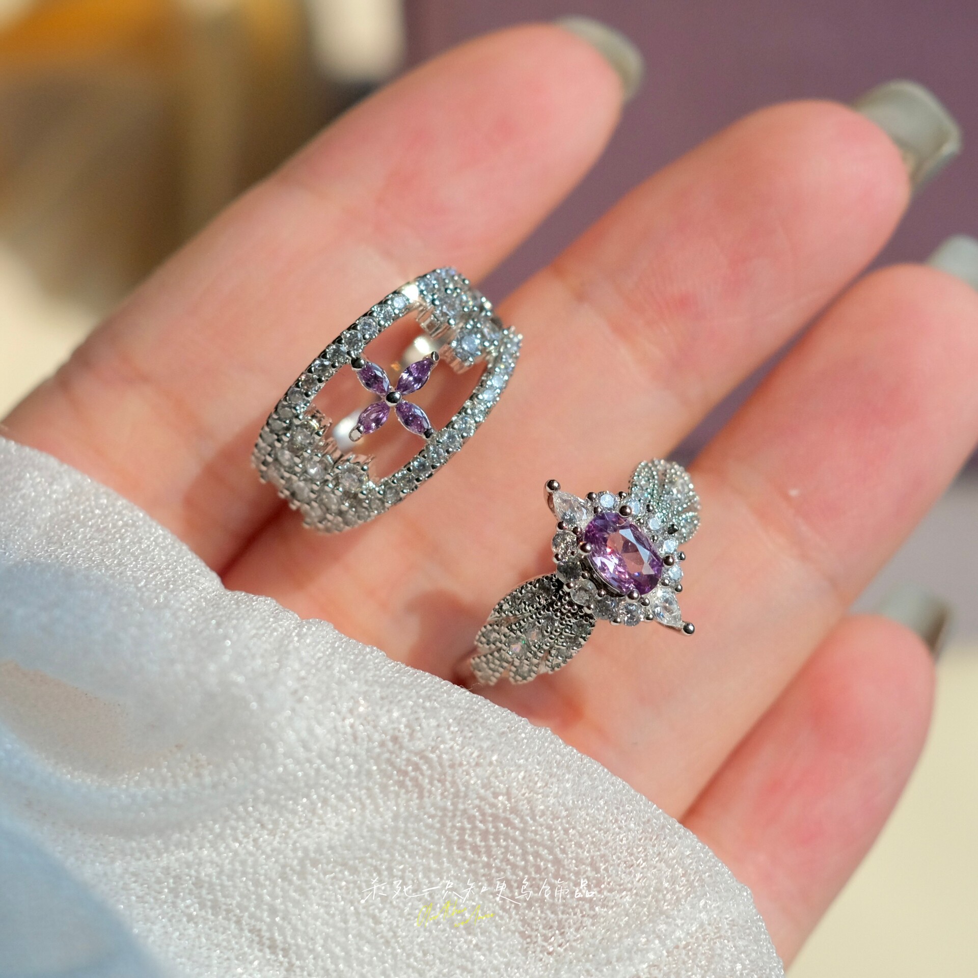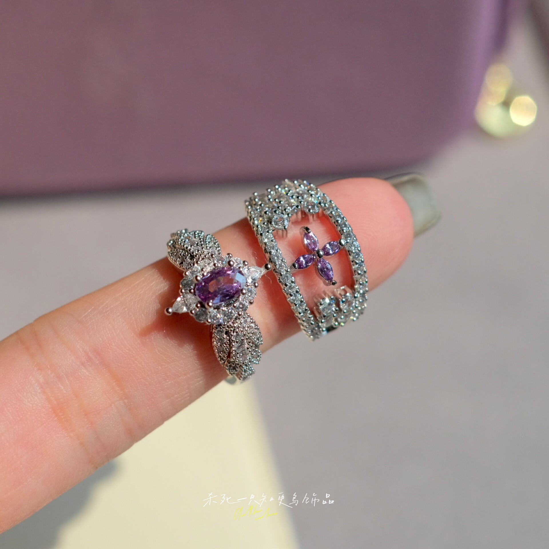 《丁香冠冕》复古精致优雅高级感银色镶钻双层四叶草开口指环戒指