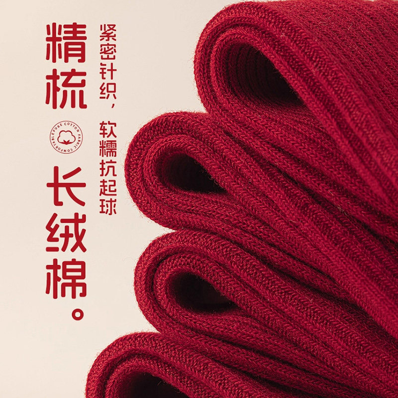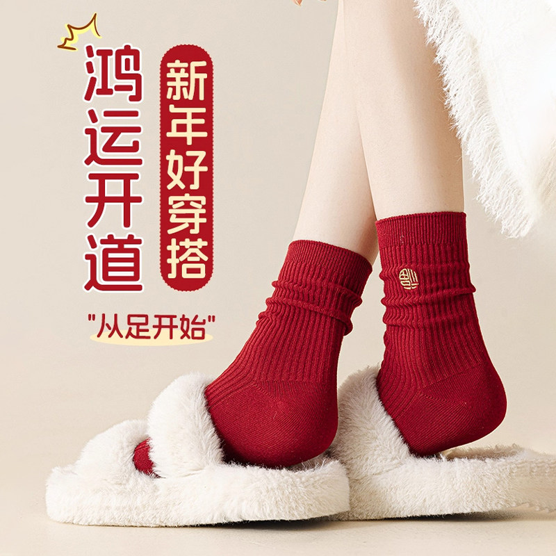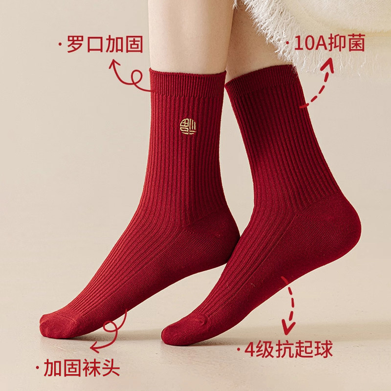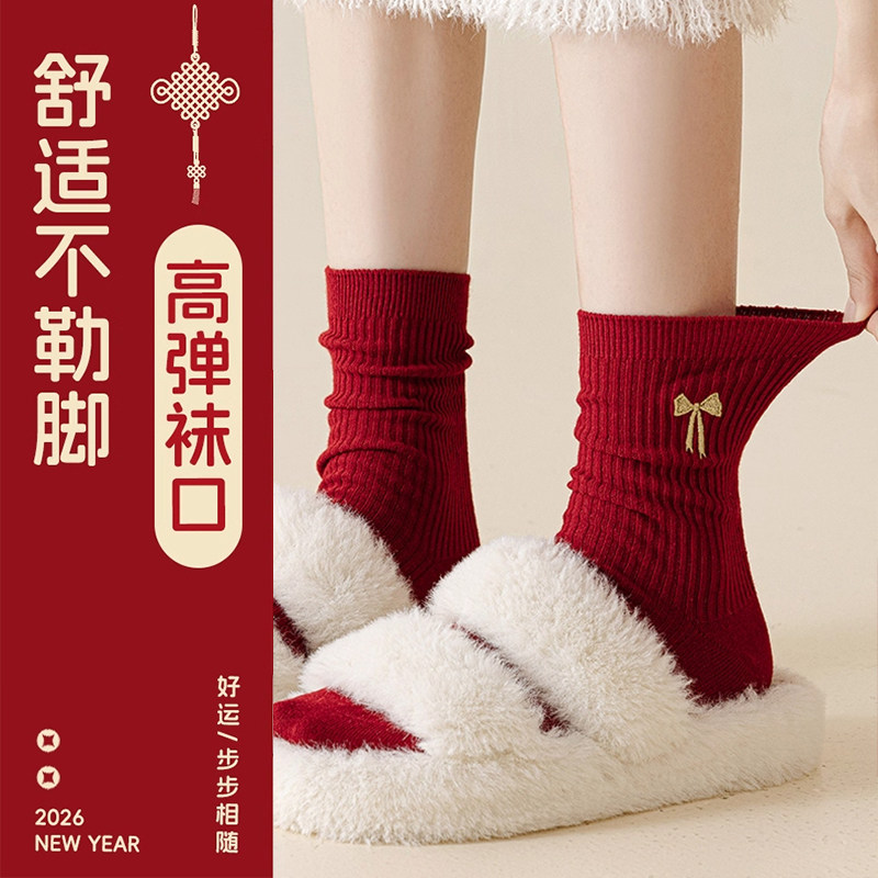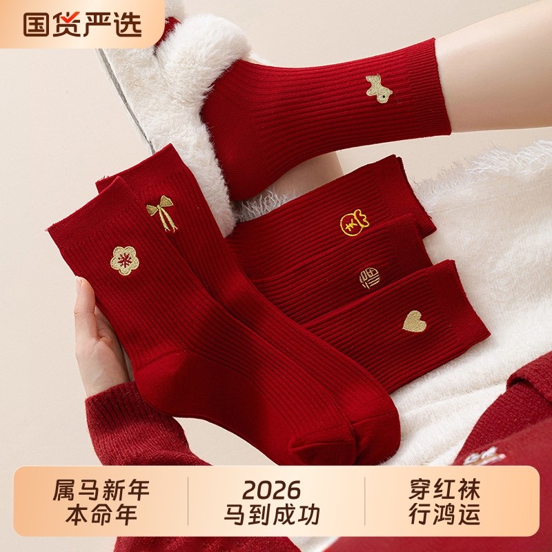 2026本命年马年新年大红色袜子女秋冬款新疆棉中筒袜情侣结婚长袜