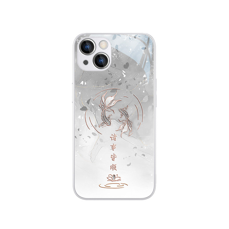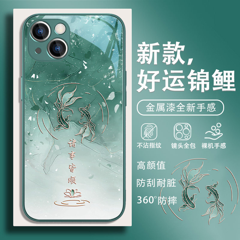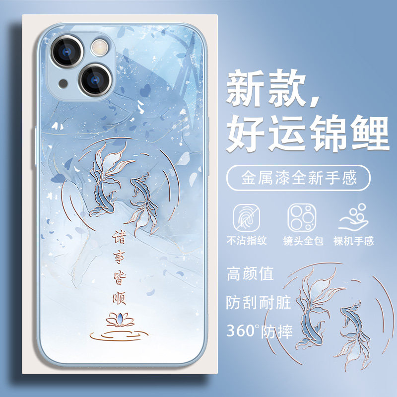 适用苹果16手机壳锦鲤15promax新款iPhone14诸事皆顺13中国风12mini小众17高级感8plus7创意11玻璃x简约xr/xs