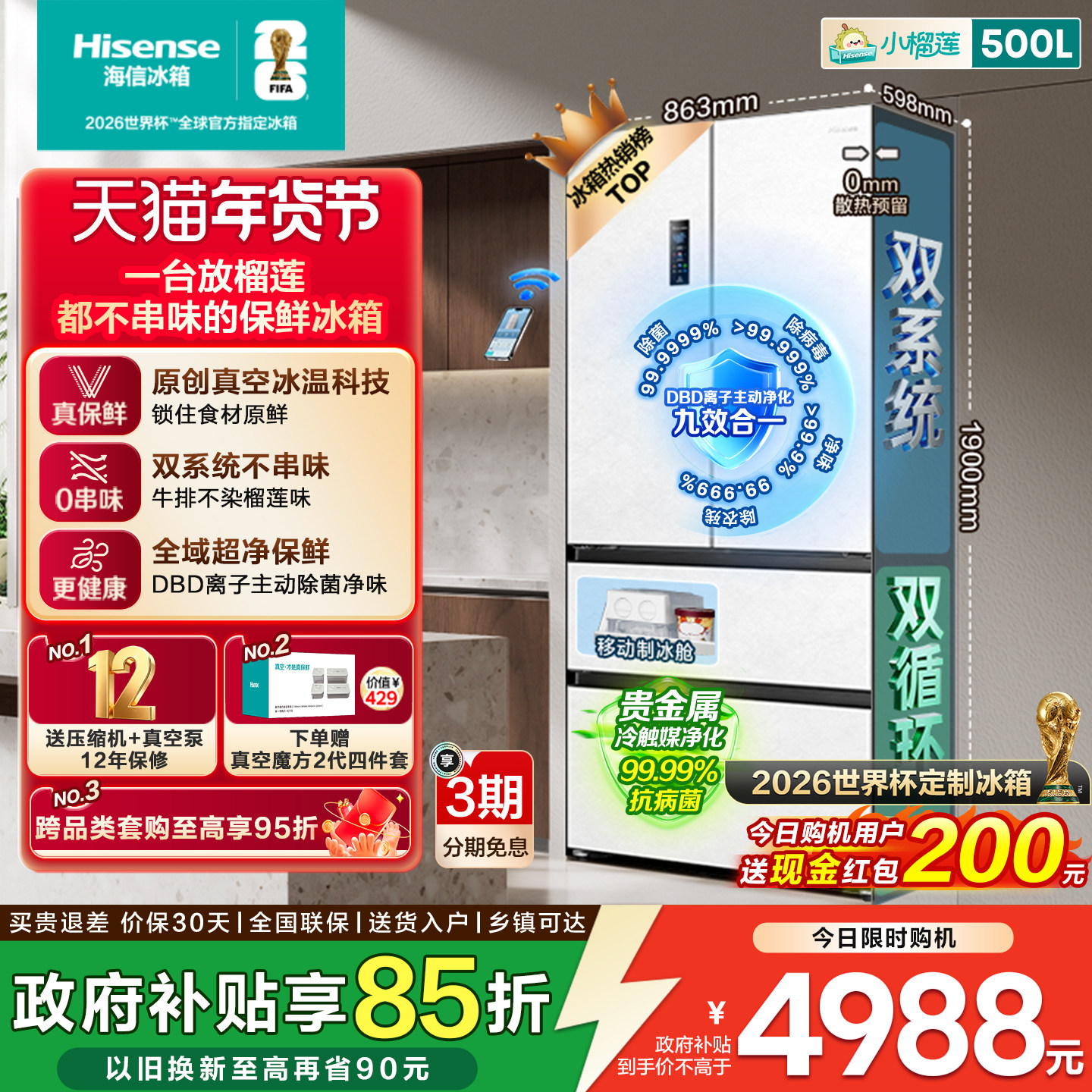 海信小榴莲500冰箱真空保鲜零嵌入法式四开门双系统超薄制冰一级