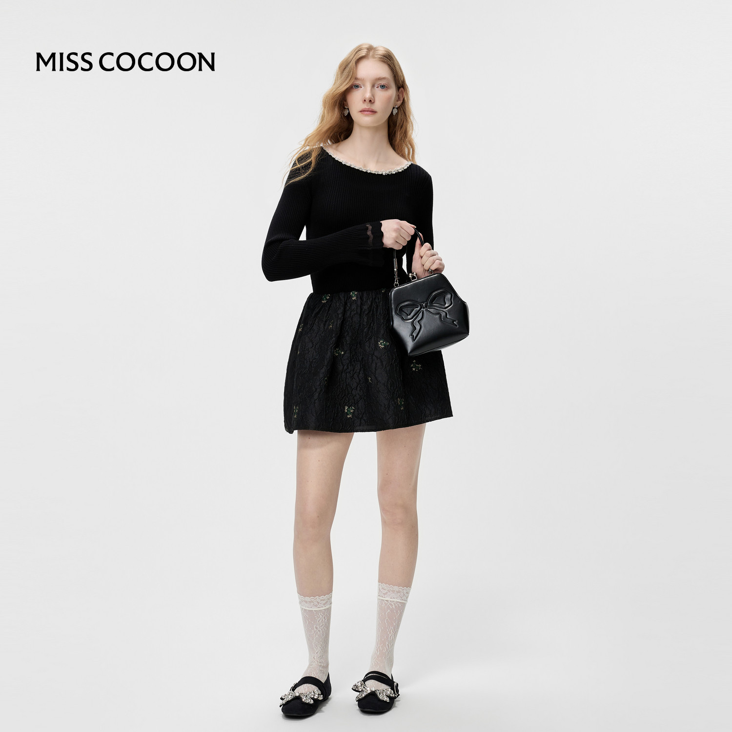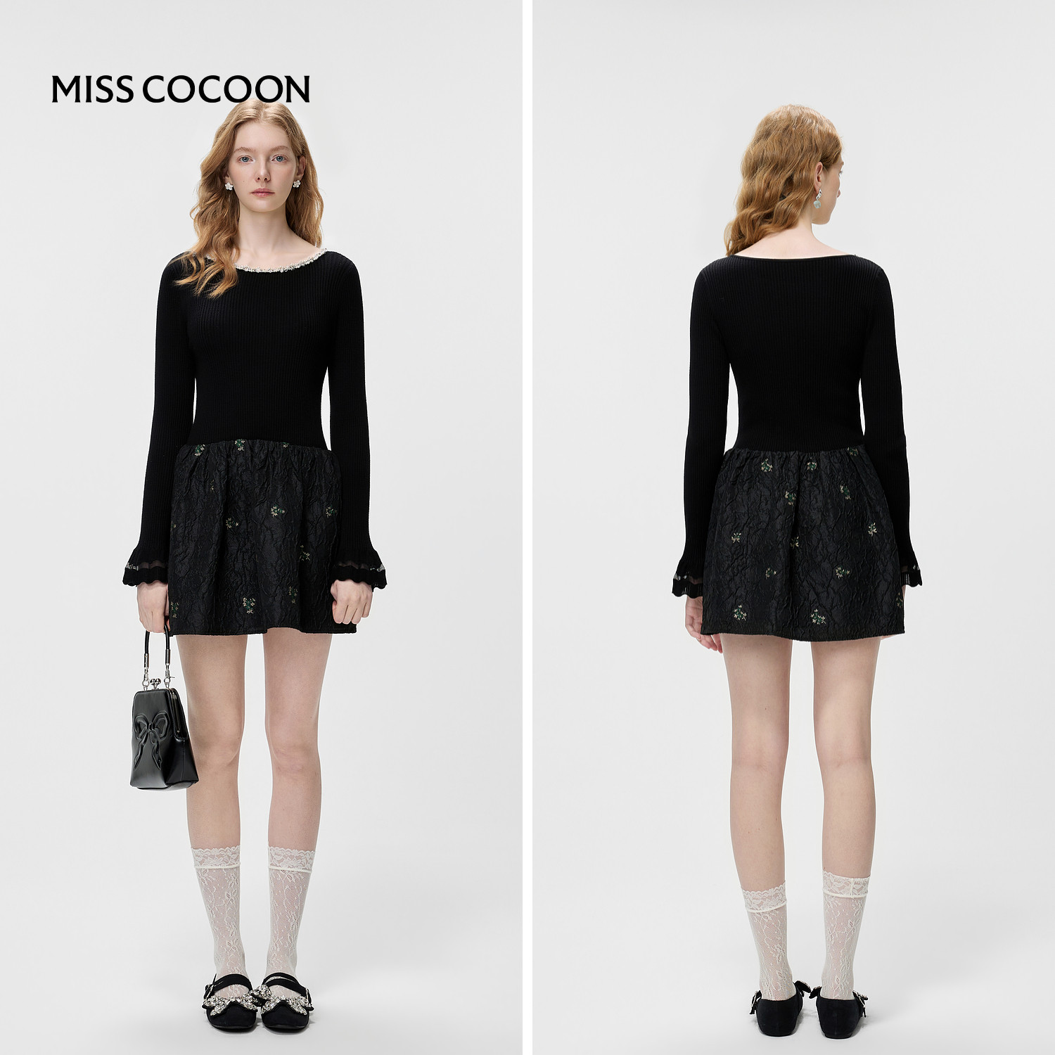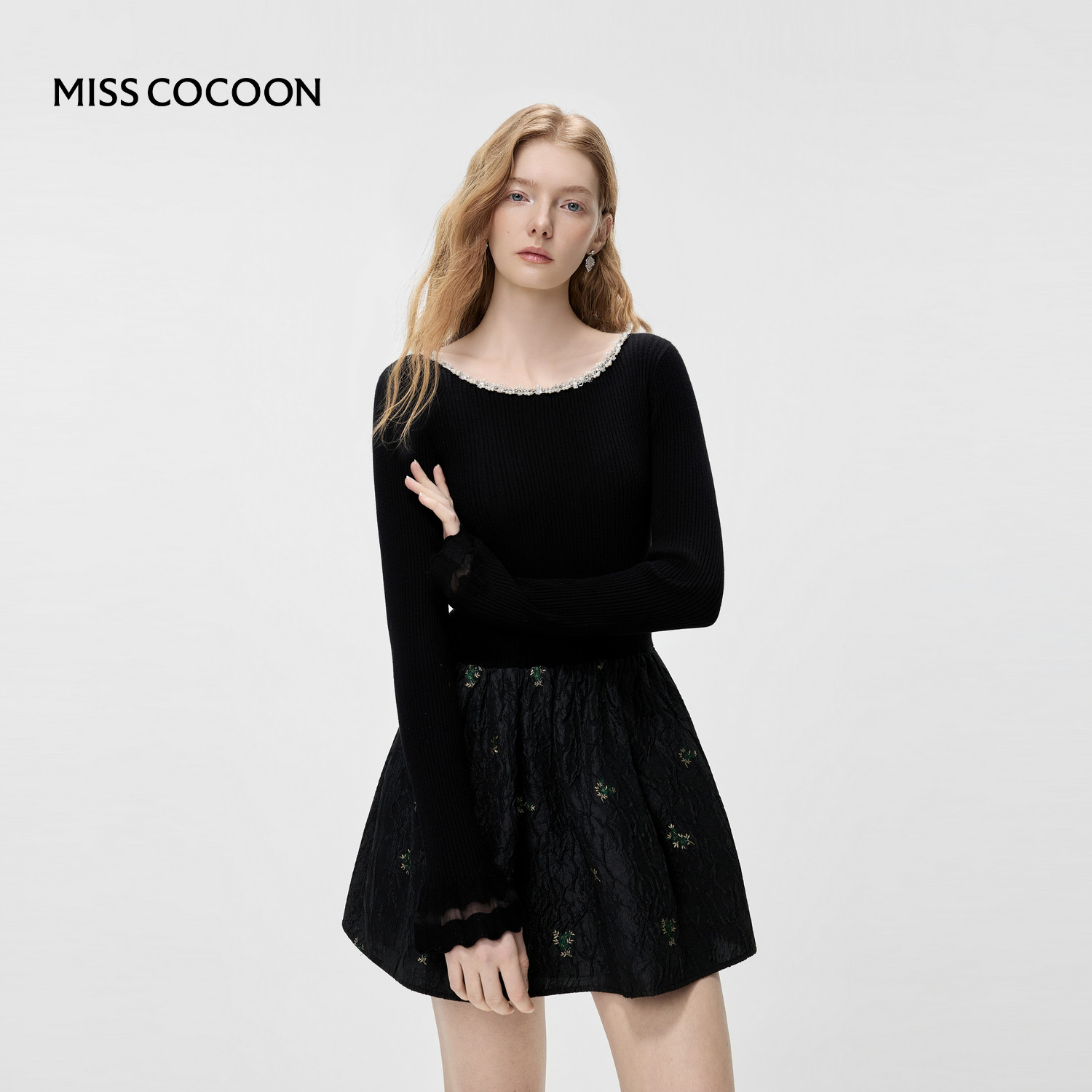 MISSCOCOON可可尼黑色针织连衣裙女2026春新款收腰假两件拼接裙裤