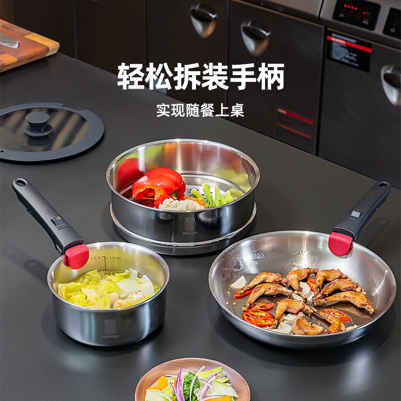 莱德斯食品级不锈钢一体锅可拆卸手柄锅套装汤锅煎炒锅多件组合装