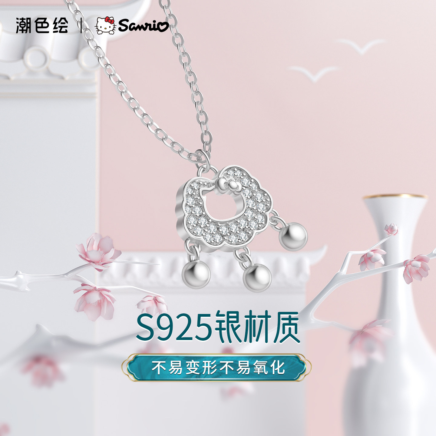 潮色绘Hellokitty项链女款平安长命银锁纯银吊坠精致饰品生日礼物