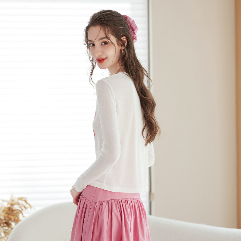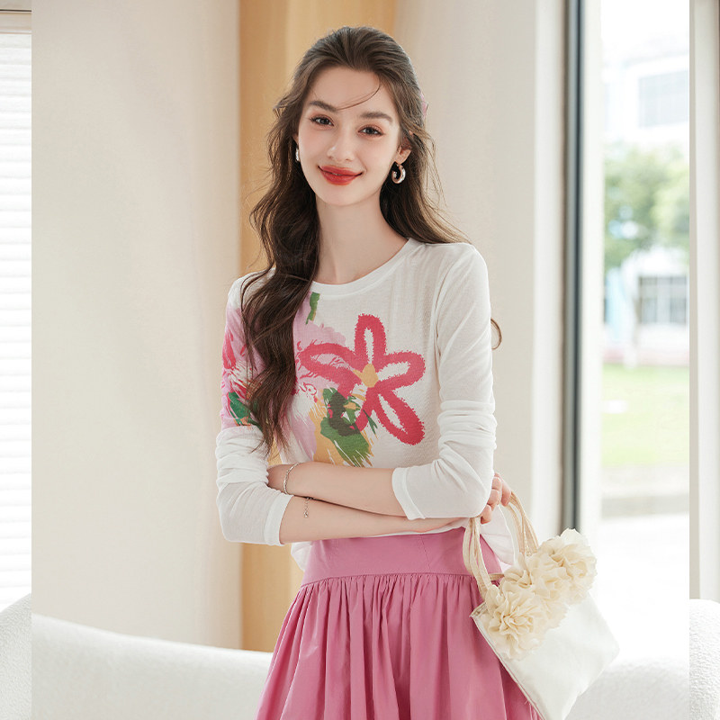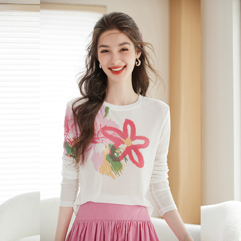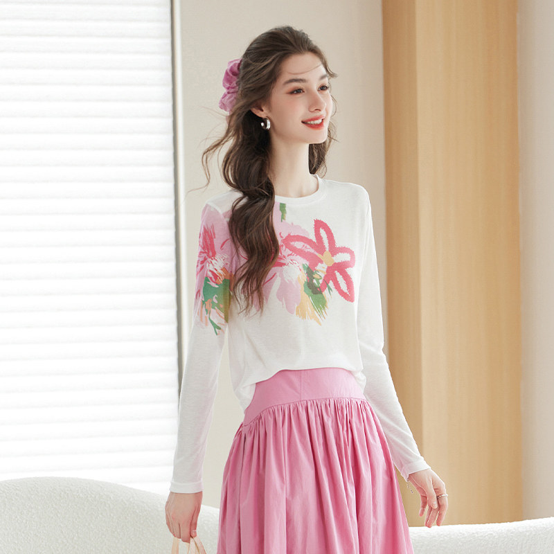白鹿语法式甜美撞色印花长袖T恤25秋新款设计感薄款显瘦打底上衣