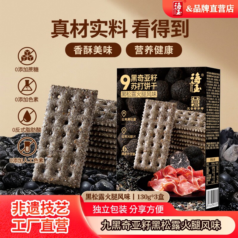 海玉九黑奇亚籽黑松露火腿苏打饼干130g*3盒追剧必备零食健康食品