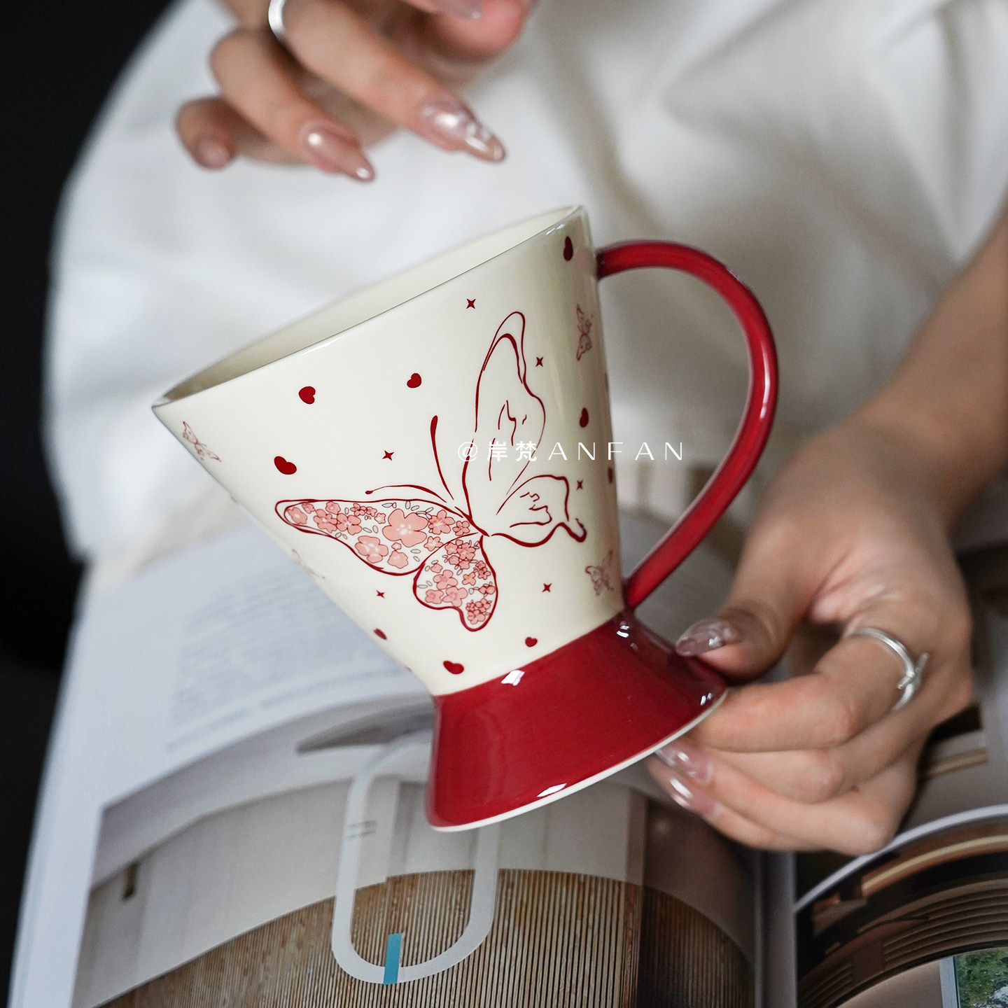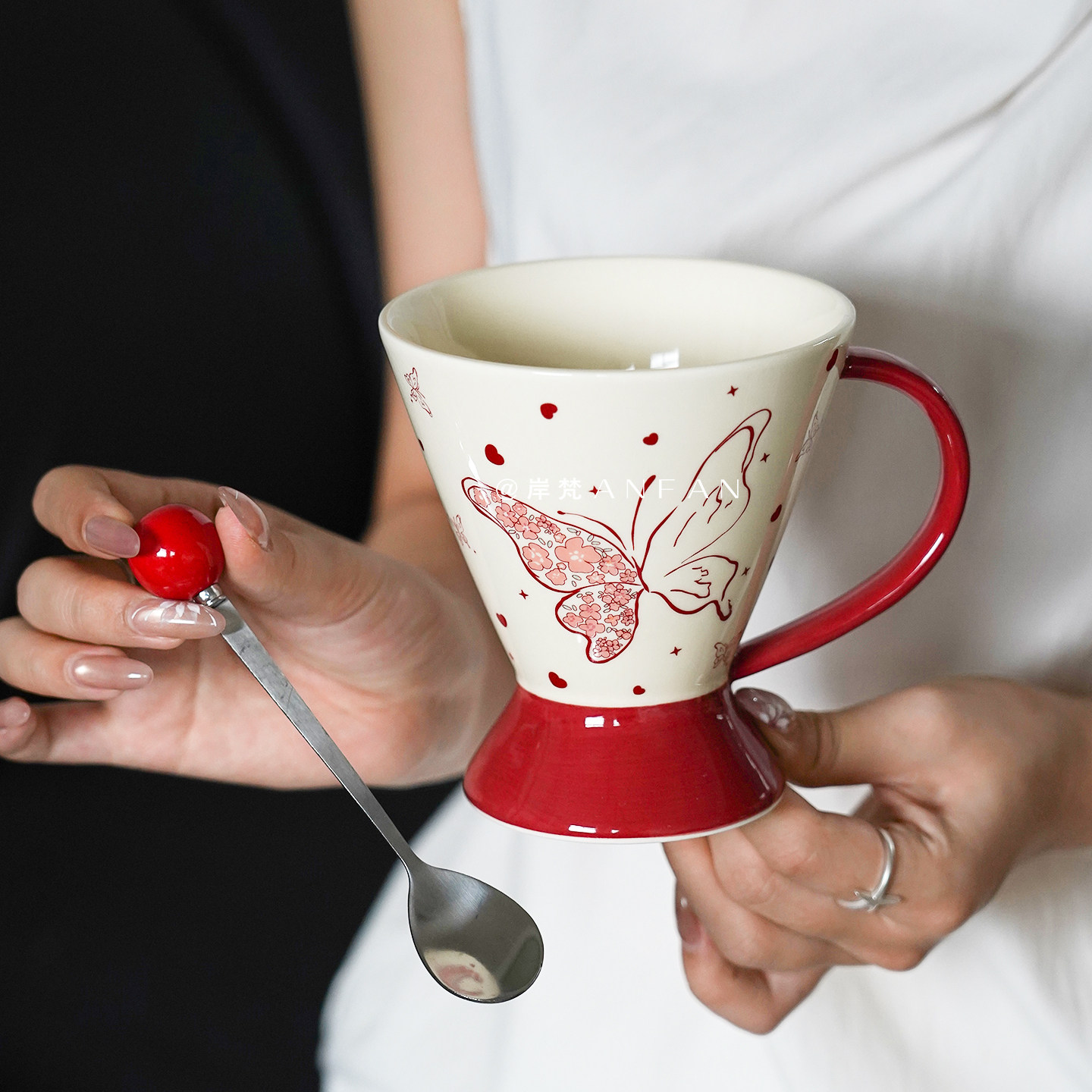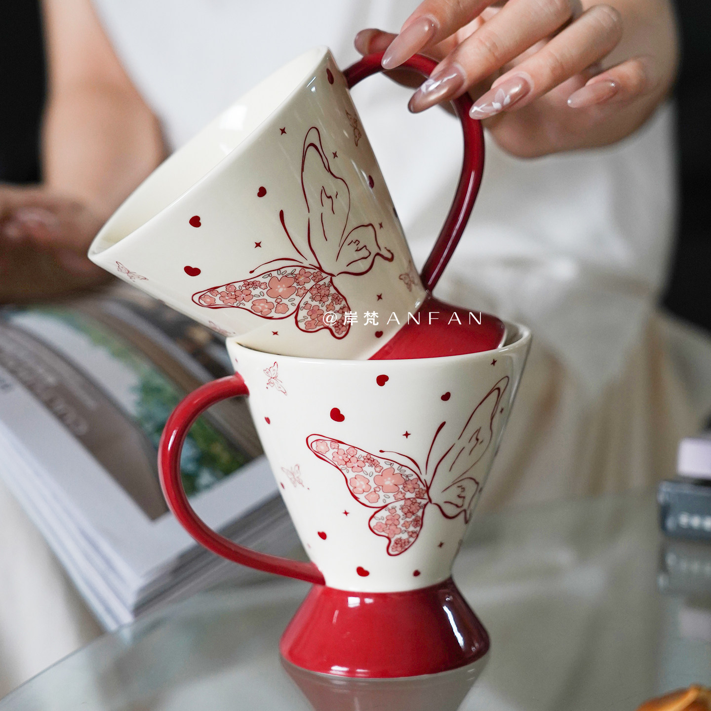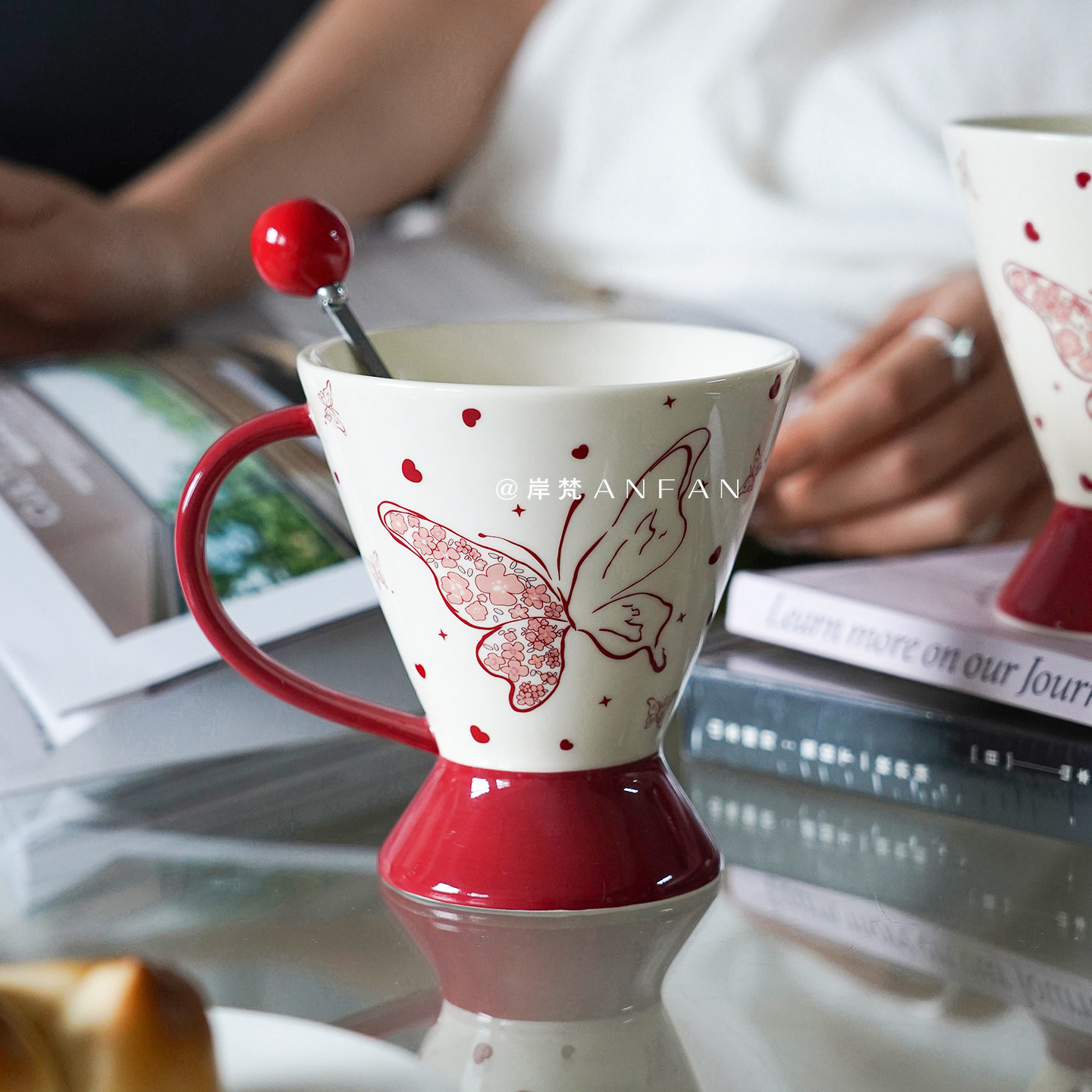 岸梵法式蝴蝶咖啡杯复古小众带勺陶瓷杯家用高脚马克杯情侣喝水杯