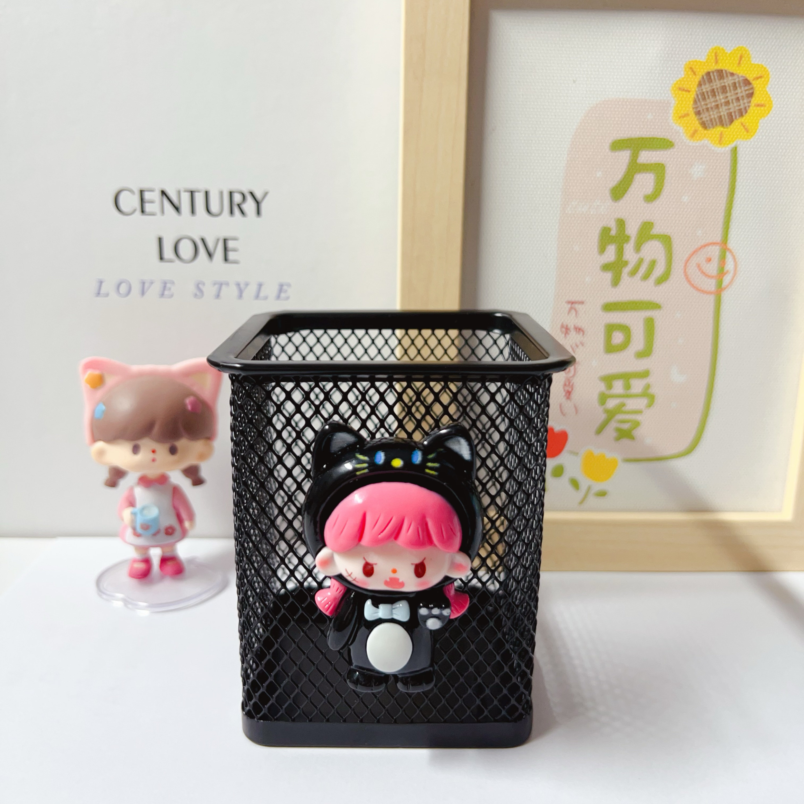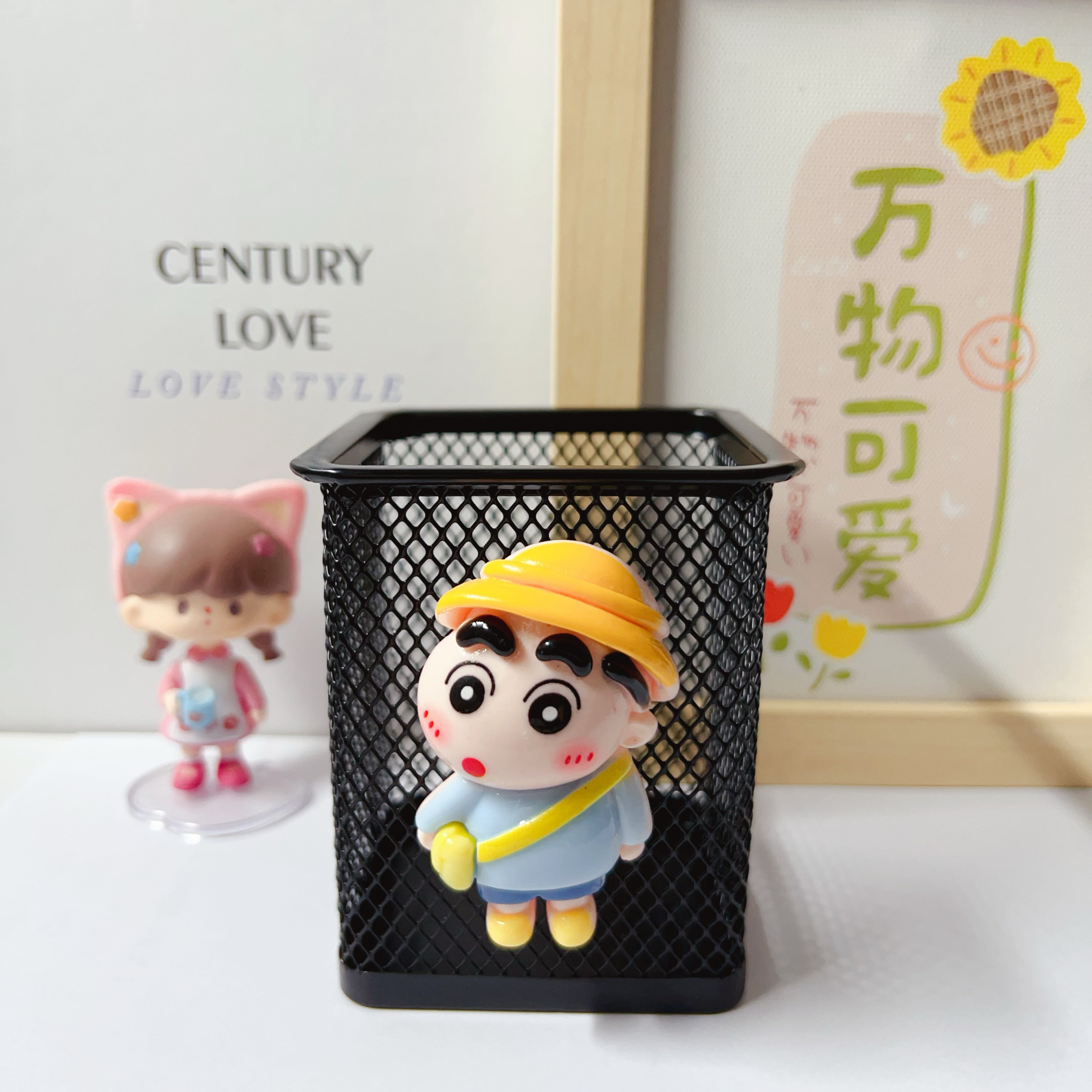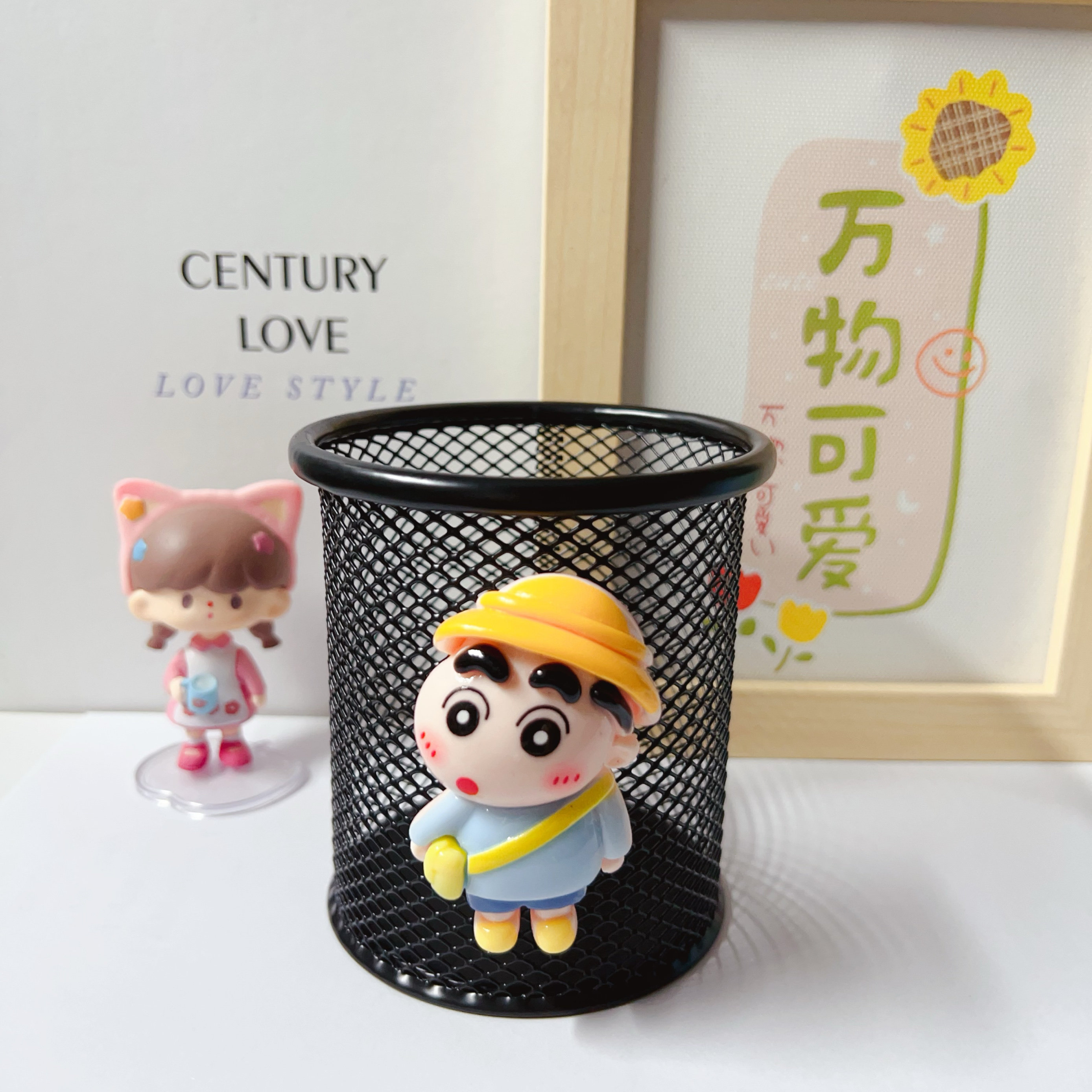 卡通可爱蜡笔小新网纹铁艺收纳盒学生桌面文具杂物整理储物杂物桶