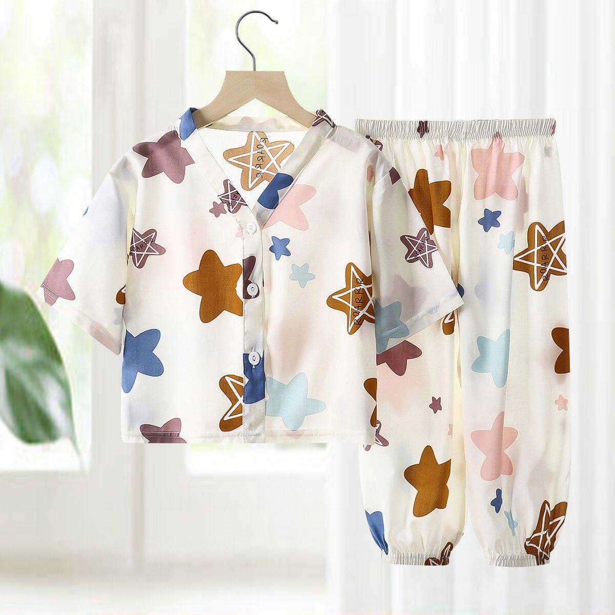 久岁伴儿童睡衣男春秋长袖宽松空调服薄款透气女童开襟家居服套装