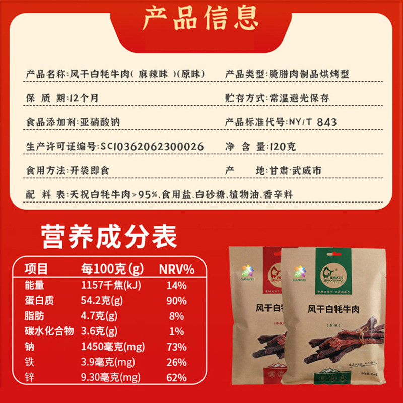 闹格尔清真草饲天祝白牦牛肉风干肉干肉条麻辣味原味甘肃特产120g
