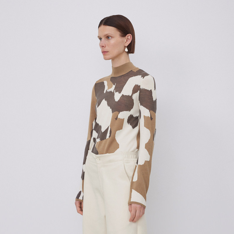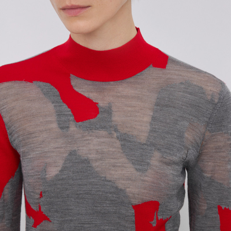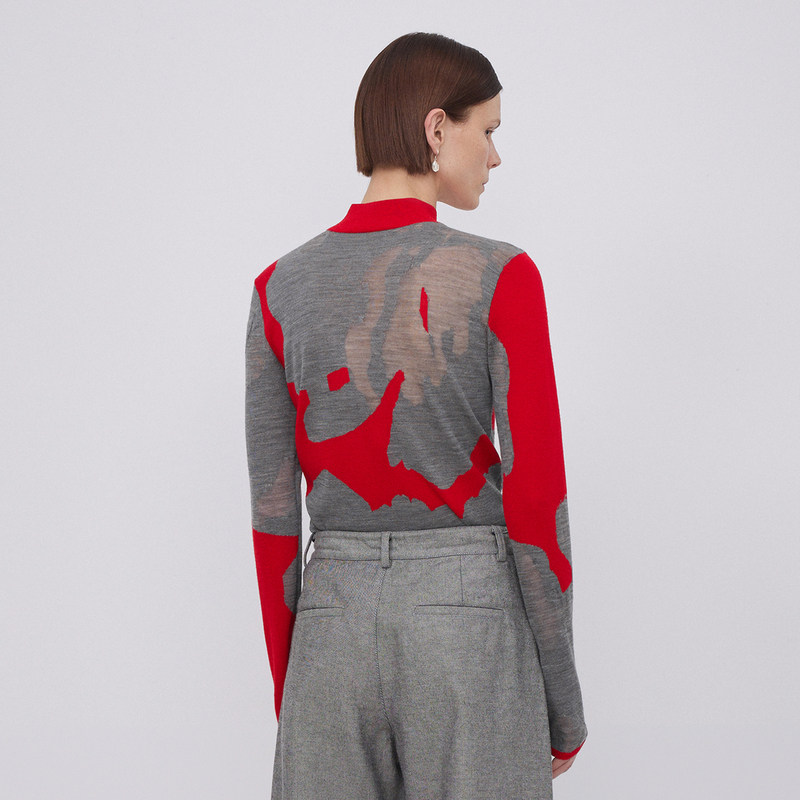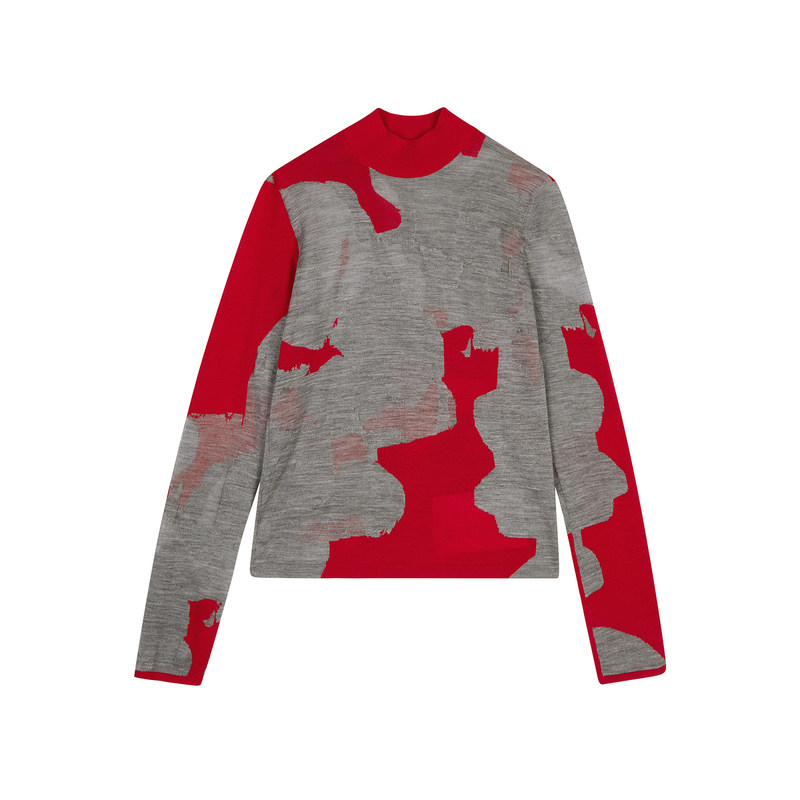 LESS绵羊毛艺术感红色拼色高领针织衫女迷彩修身薄毛衣2N0313310