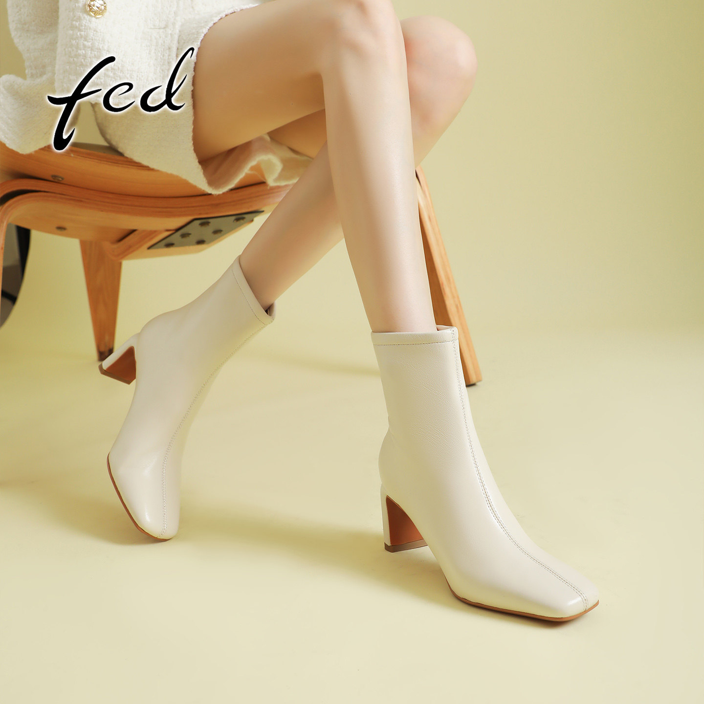 fed法式复古真皮粗跟瘦瘦靴女秋冬新款后拉链气质方头高跟小短靴