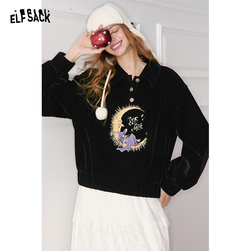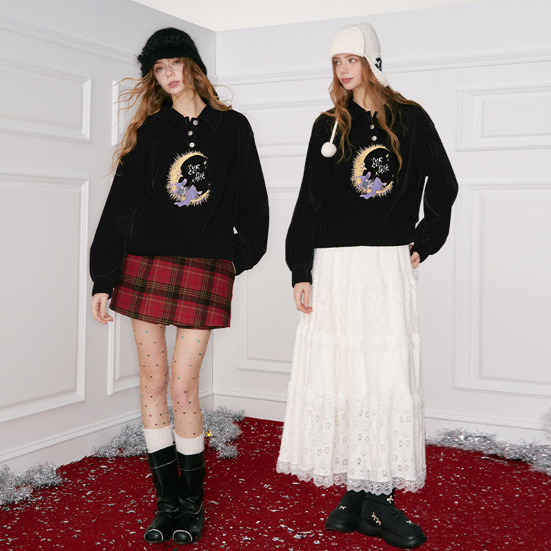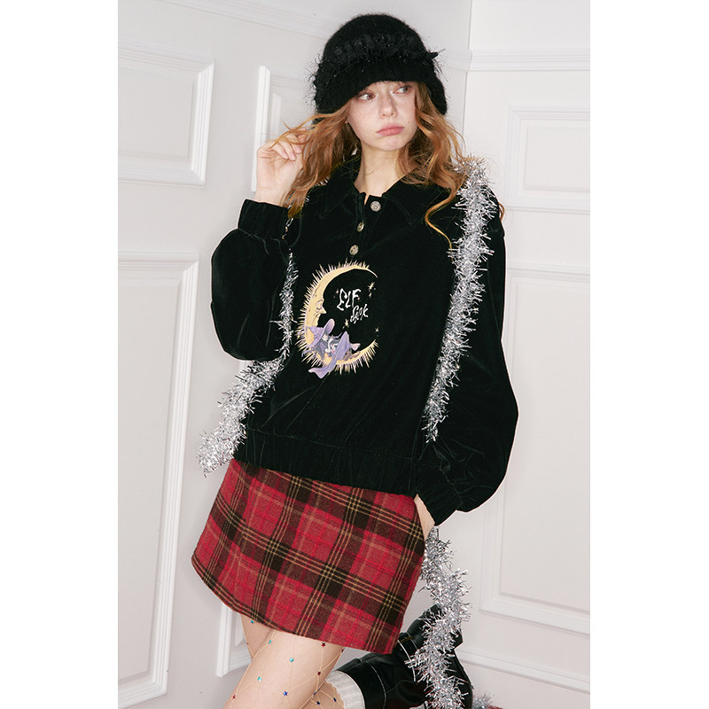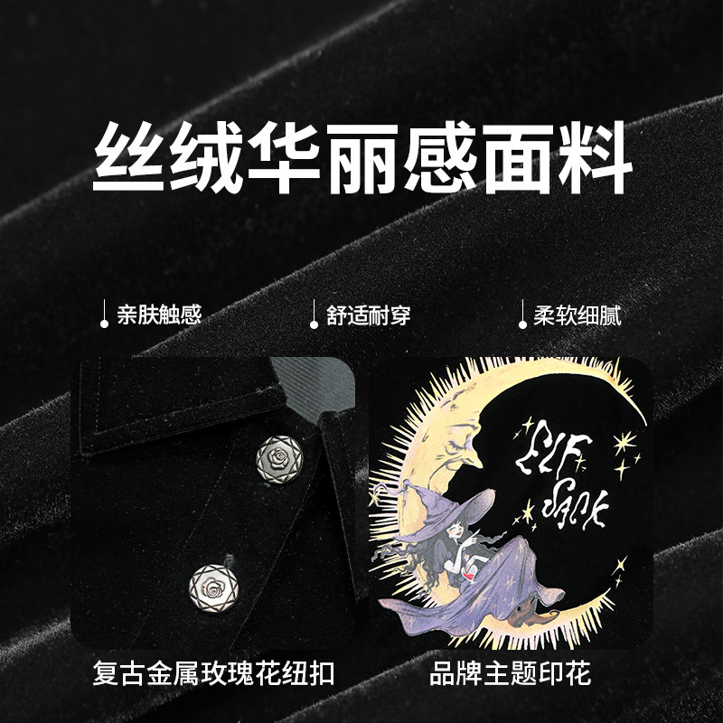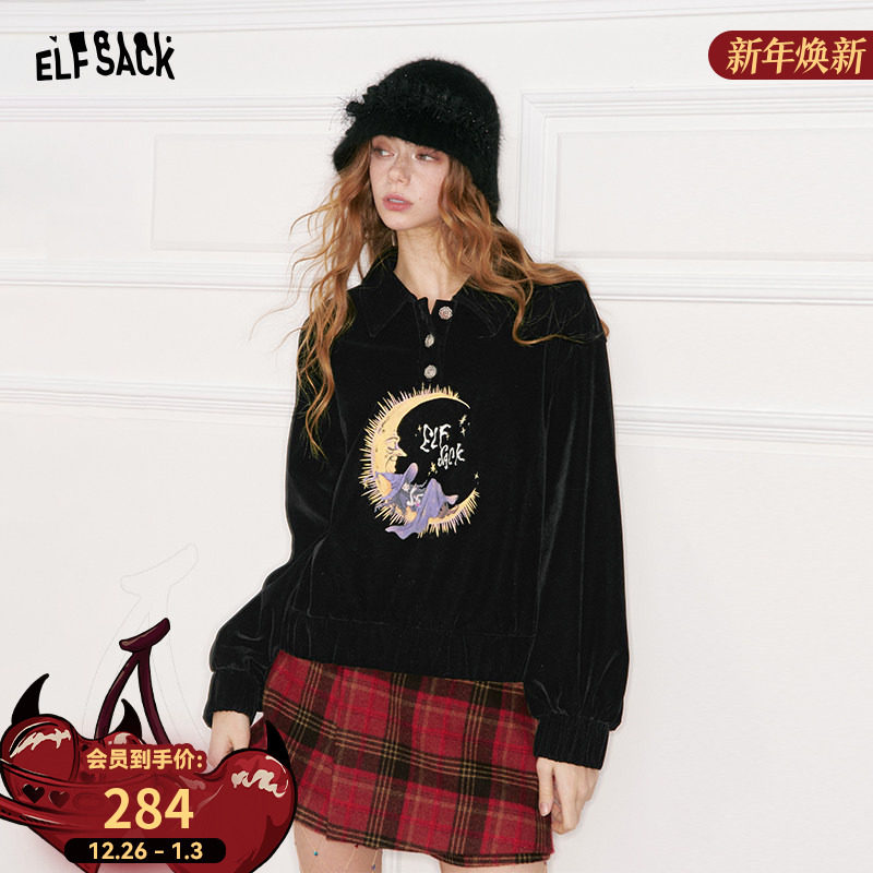 妖精的口袋复古印花黑色丝绒套头卫衣女2025冬新款小个子短款上衣