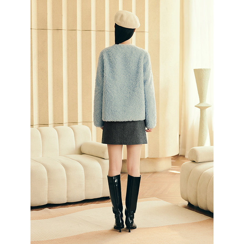 YINER音儿专选2025冬季新款法式静奢风美羊卷肌理H型圆领短款外套