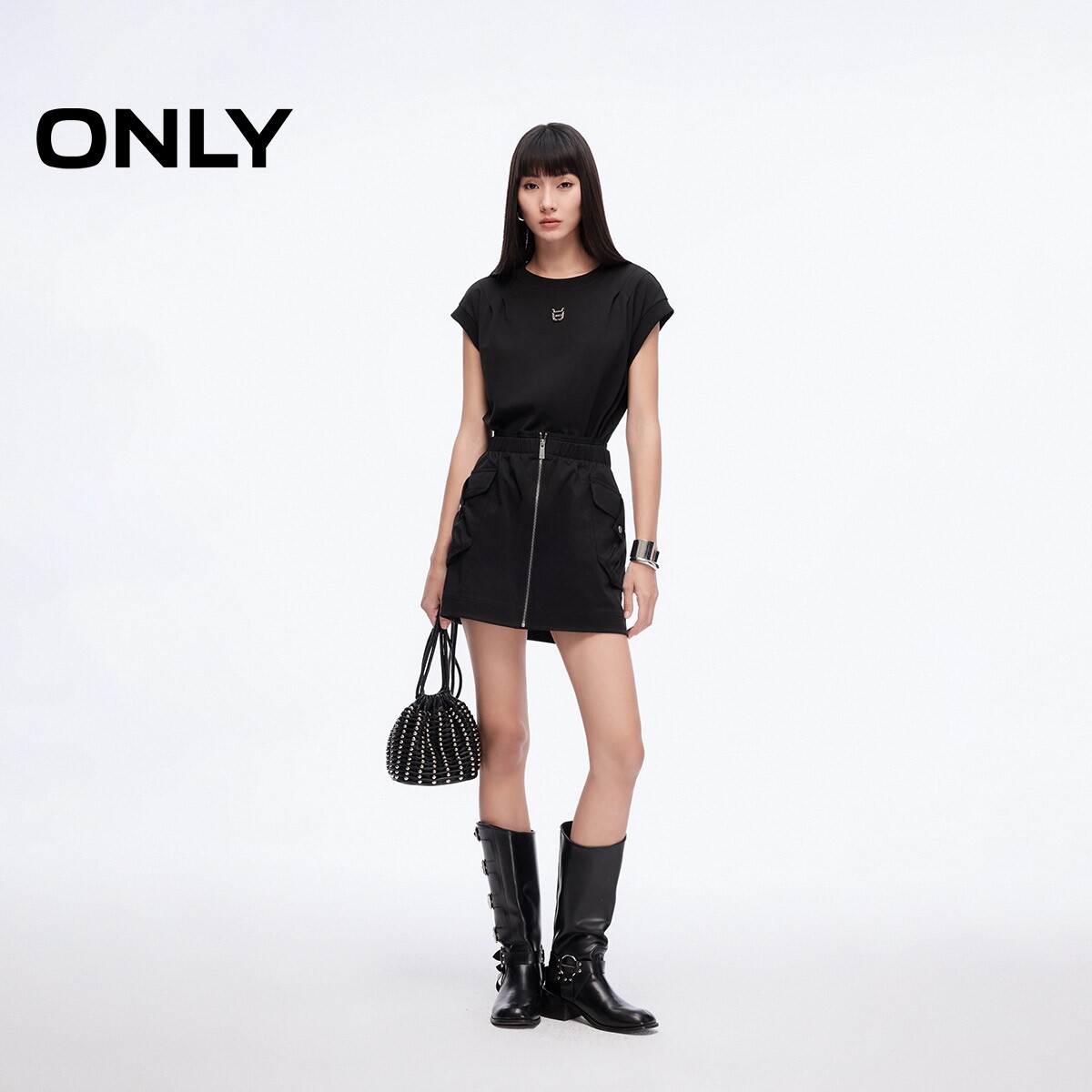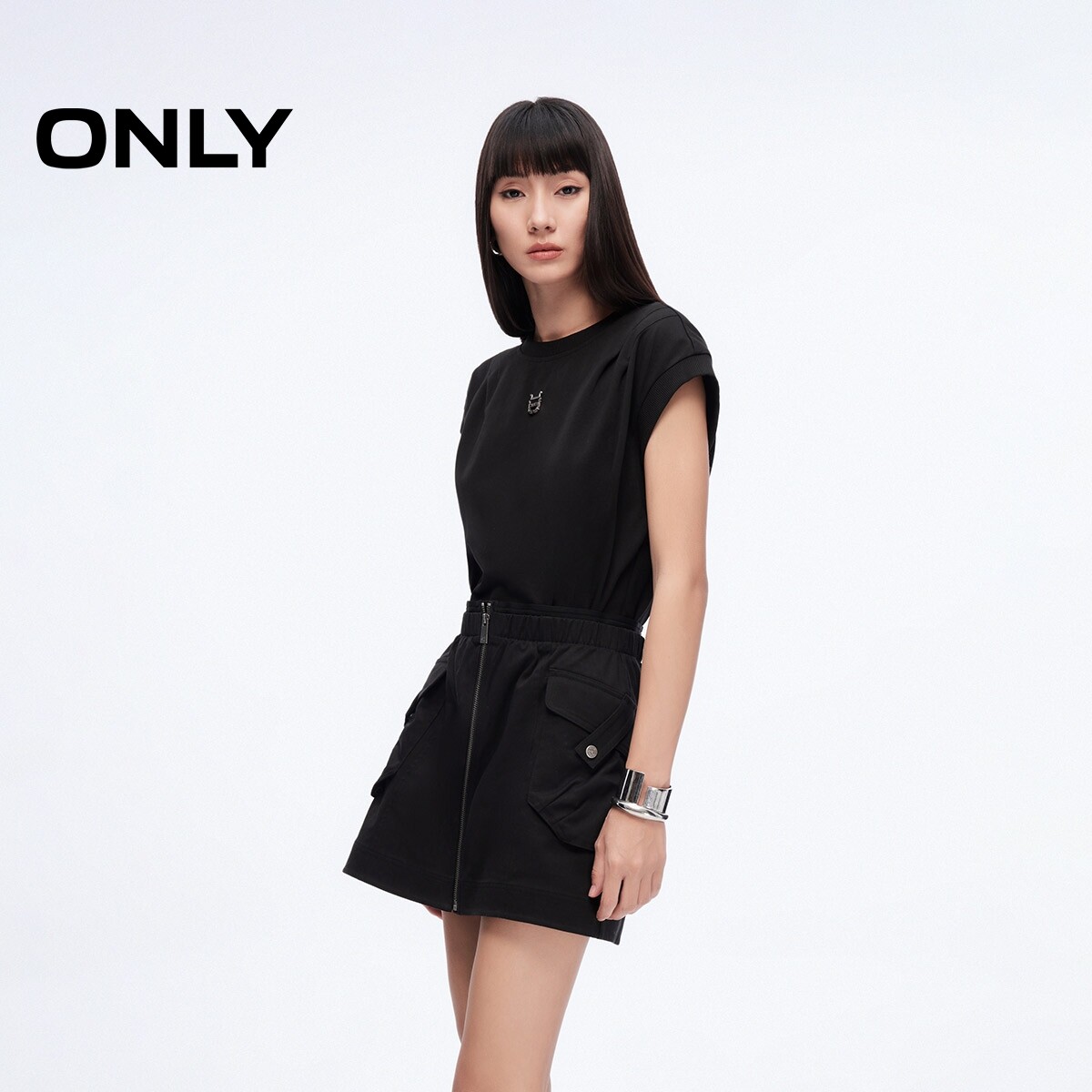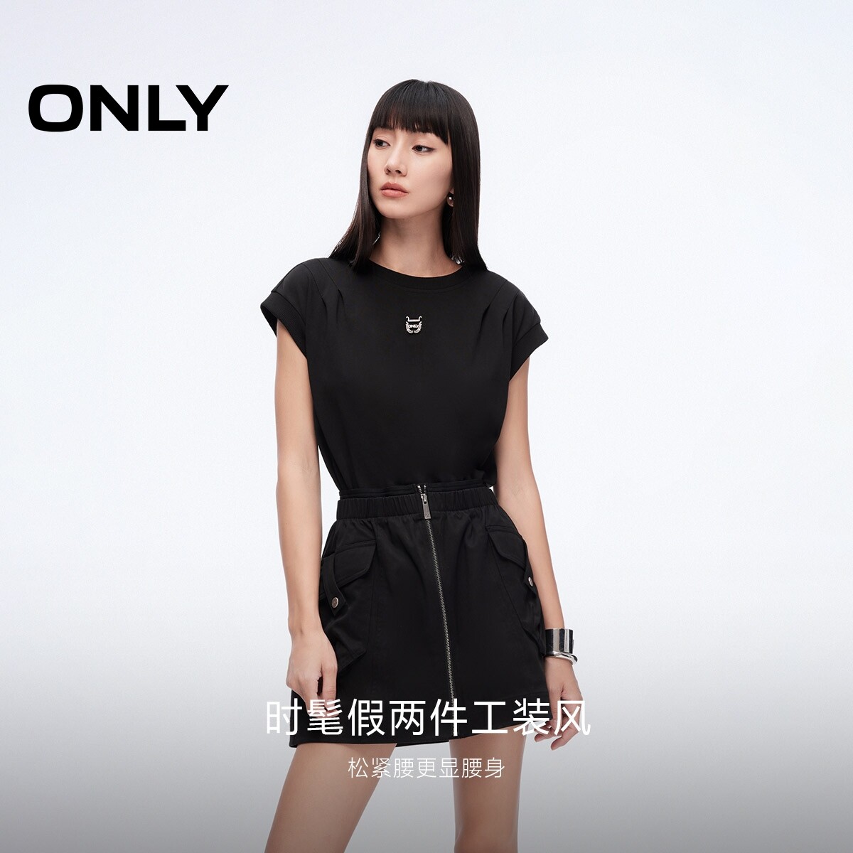 【ONLY奥莱】春季新款时髦工装风拼接假两件口袋圆领短裙连衣裙女