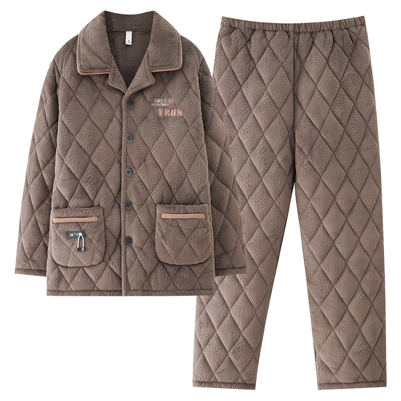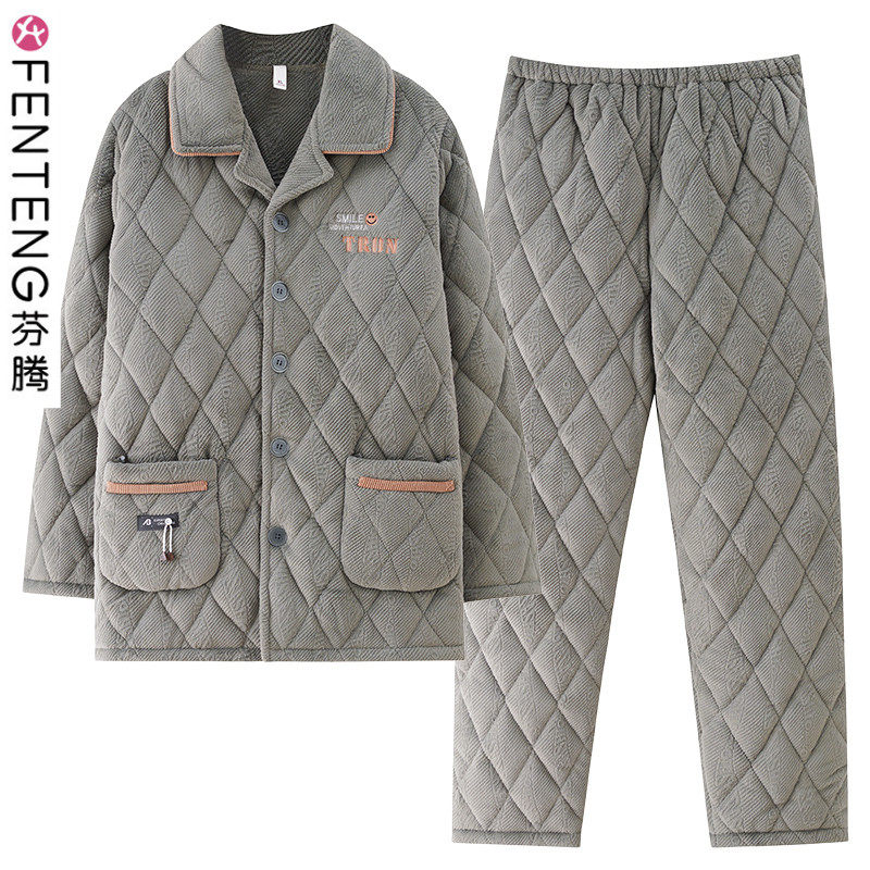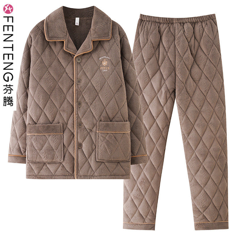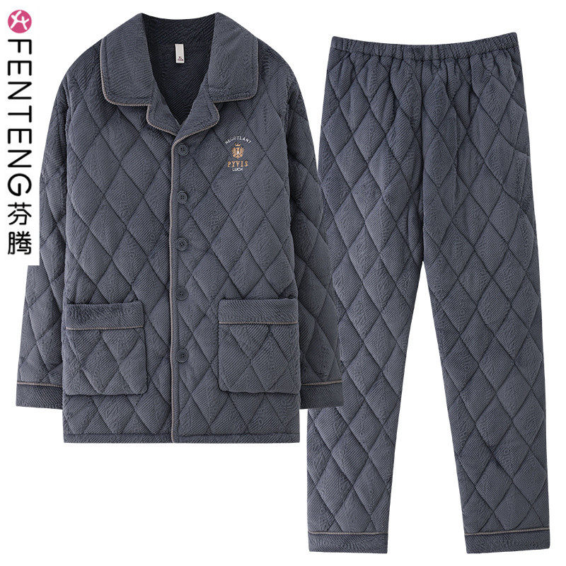 芬腾新款睡衣男士秋冬款三层加厚加绒夹棉袄珊瑚绒中年家居服套装