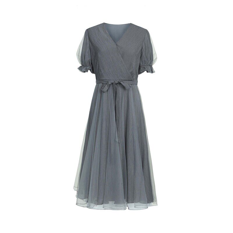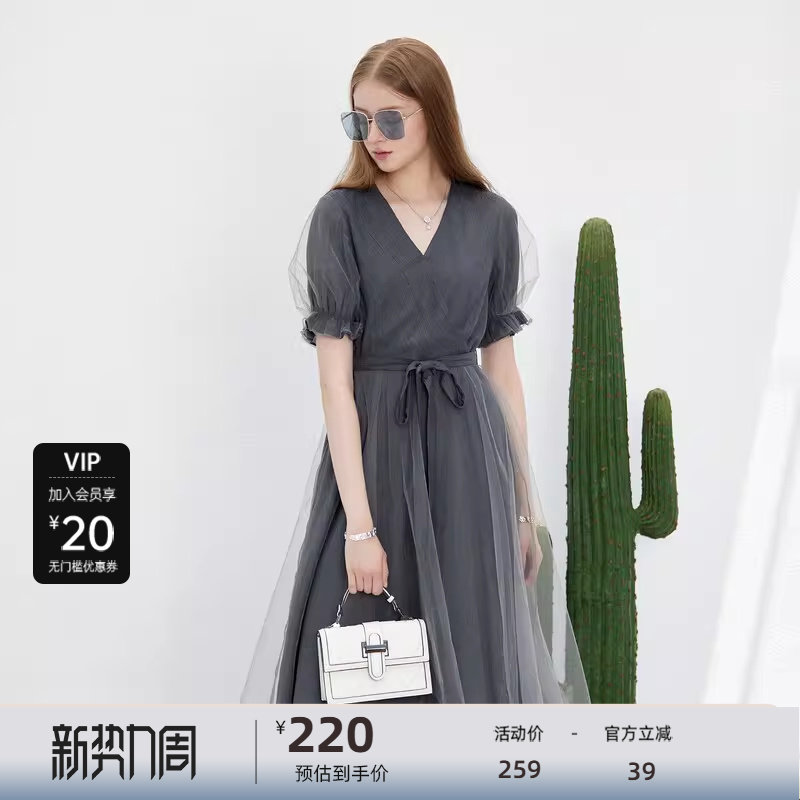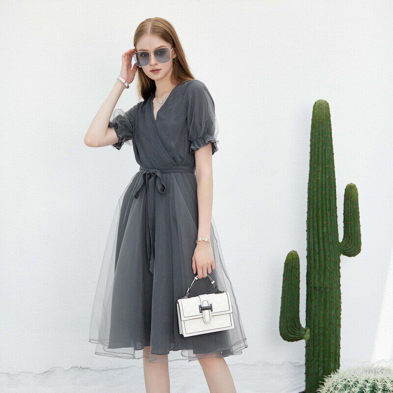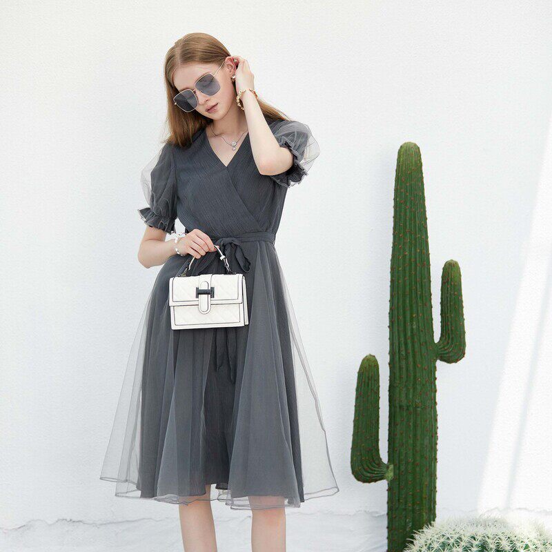 V领连衣裙 收腰泡泡袖 网纱拼接