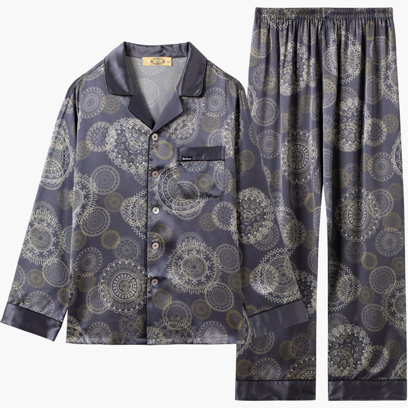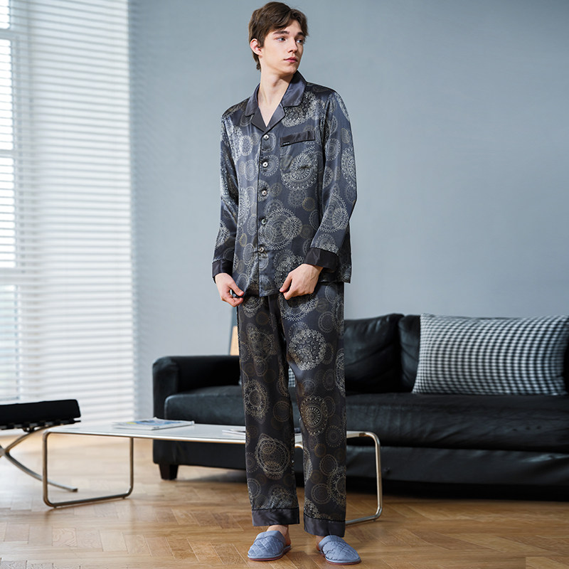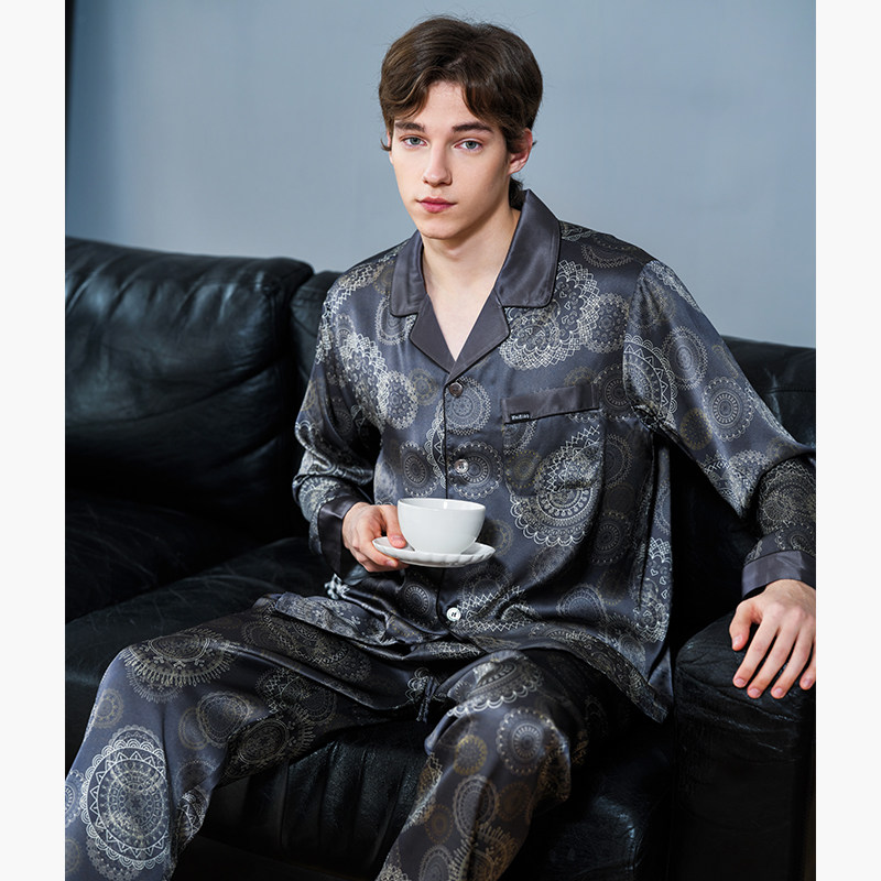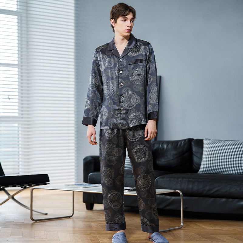 美标春夏6A级重磅男士长袖真丝睡衣套装100%桑蚕丝绸休闲家居服秋