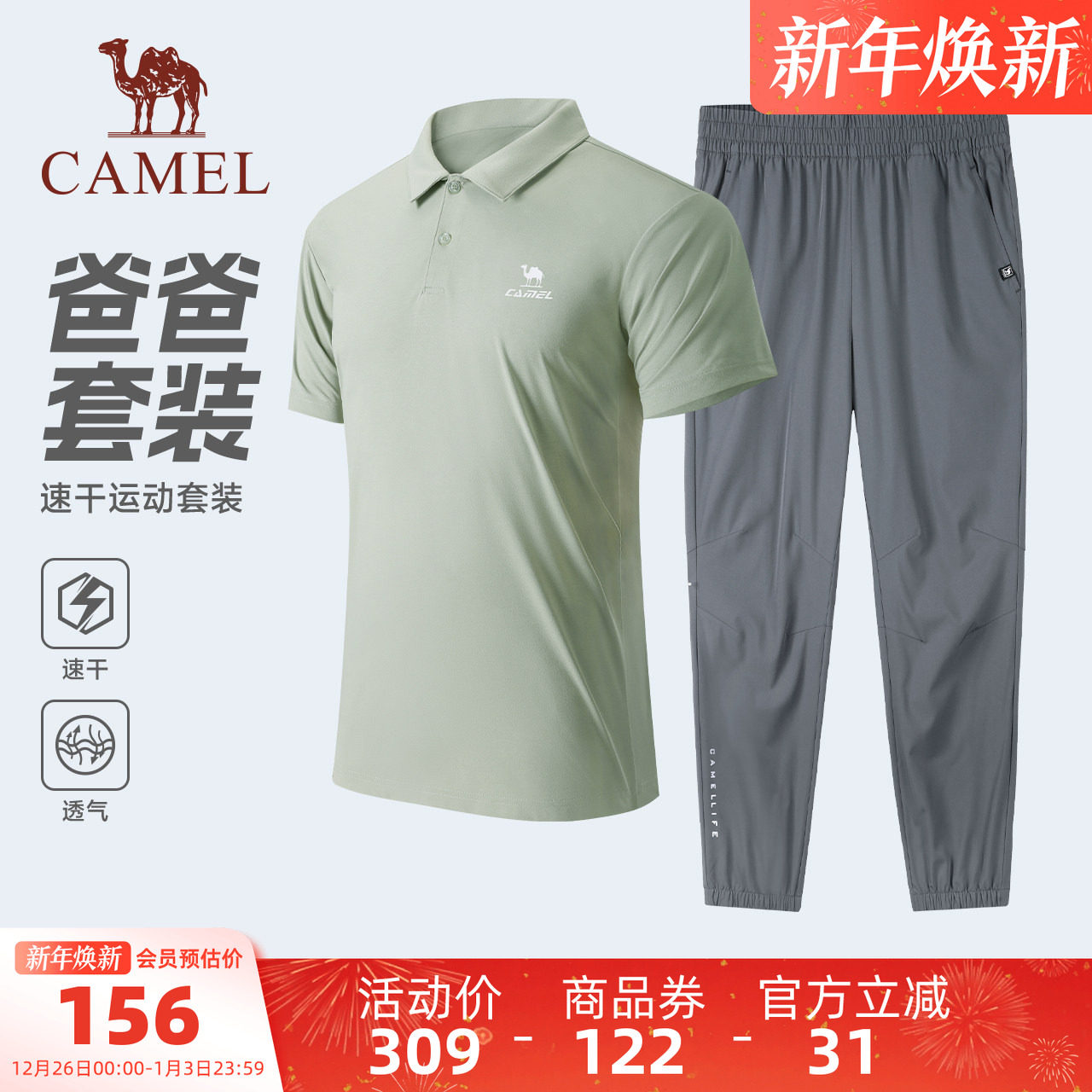 骆驼运动套装男士短袖polo衫爸爸夏季T恤速干长裤商务两件套女